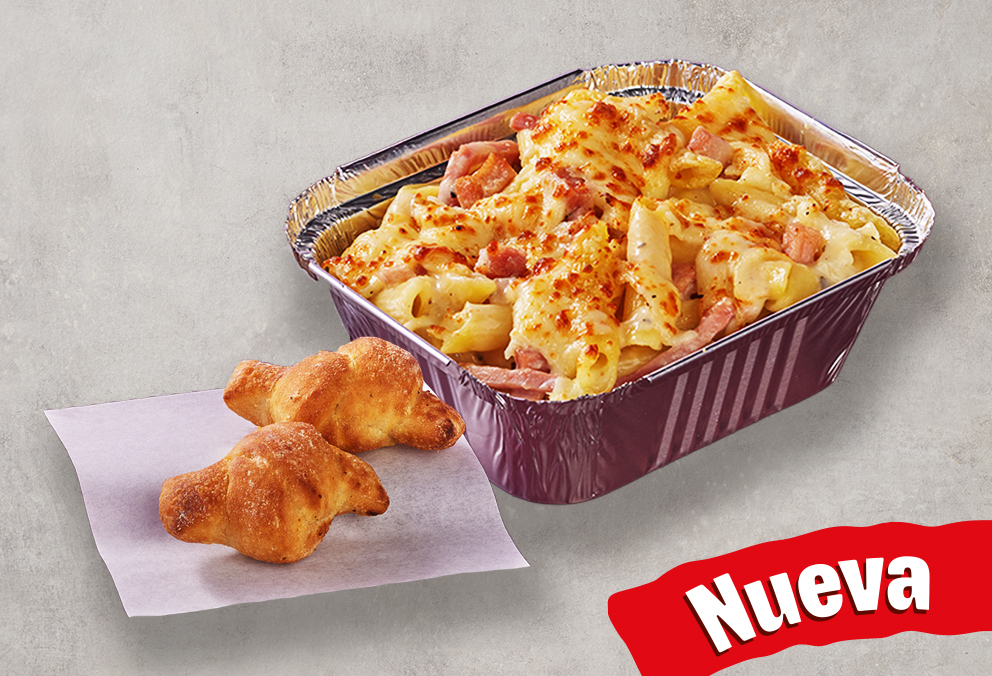 Pasta corta con Jamón y tocineta , queso mozzarella, con mezcla de salsa de ajo y bechamel con especias. Acompañada de dos knots de pan recién horneados.