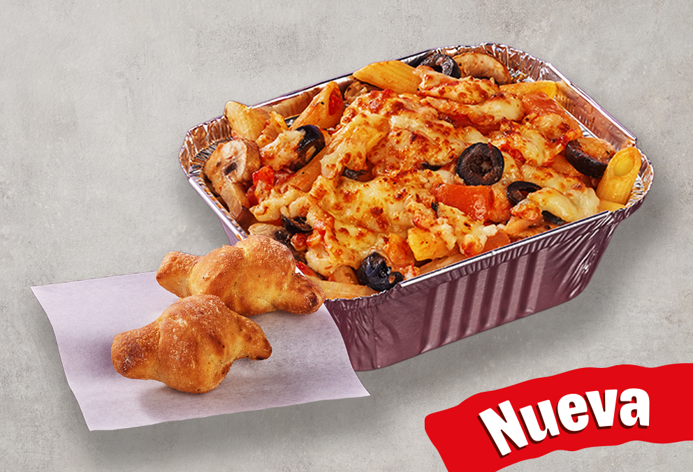 Pasta corta con champiñones, aceitunas negras, verduras frescas (tomate, cebolla) y queso mozzarella . Con mezcla de salsa pizza, bechamel y ajo, acompañada de dos knots de pan recién horneados.