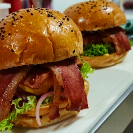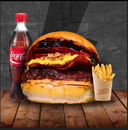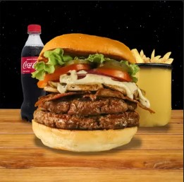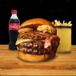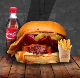 150 g de res artesanal, 2 tocinetas, jamón, queso cheddar, lechuga, tomate, cebolla encurtida y salsas de la casa (tomate, mayonesa y mostaza), envuelta en masa madre madura, pasta de tomate y queso gratinado con papas a la francesa artesanal y gaseosa Productos Postobón.