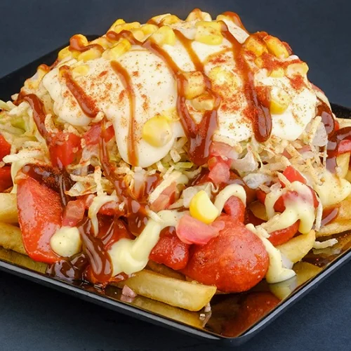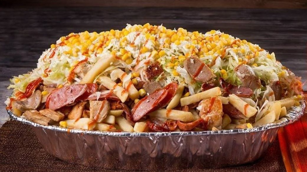 375gr papa 100% artesanal, Maíz dulce, pollo desmechado, carne desmechada, salchicha americana, papas chip, mezcla de quesos, tocineta, chorizo 100% res y salsas de la casa (maiz, leña, bbq y tomate).