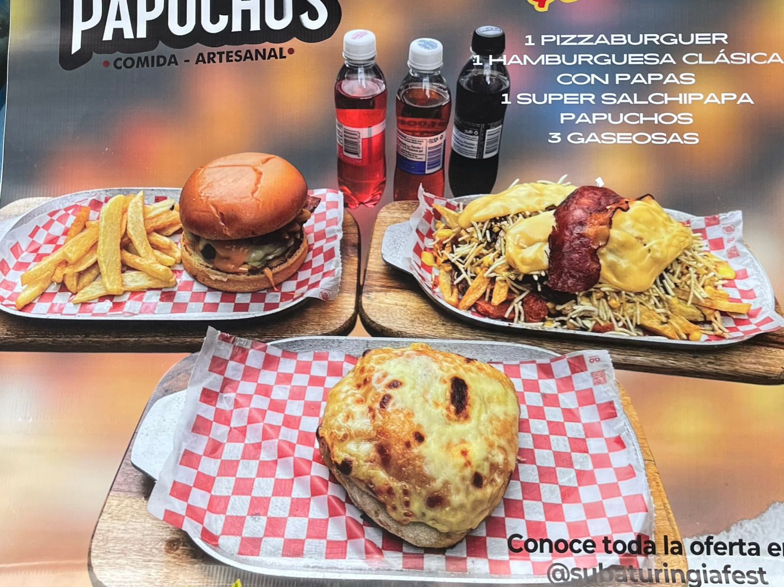 1 Pizza Burger, 1 Super salchipapa Pauchos, 1 hamburhuesa clasica con papas y 3 gaseosas 250ml