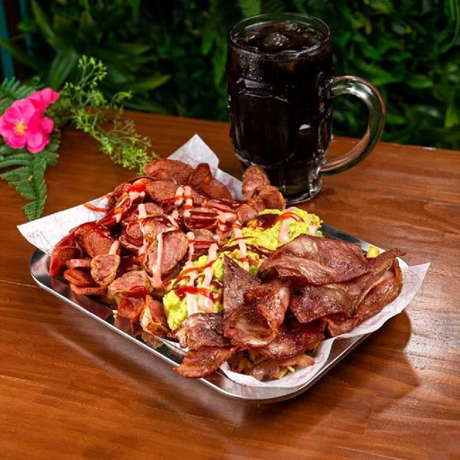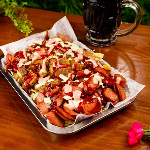 1000gr papa 100% artesanal, Maíz dulce, pollo desmechado, carne desmechada, salchicha americana, papas chip, mezcla de quesos, tocineta, chorizo 100% res y salsas de la casa (maiz, leña, bbq y tomate).