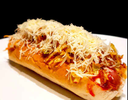 Pan artesanal, carne desmechada, pollo desmechado, salchicha americana, tocineta, jamón, lechuga, cebolla encurtida, maíz tierno, mezcla de quesos de la casa (mozzarella y cheddar), y salsas (tomate, mayonesa y mostaza).