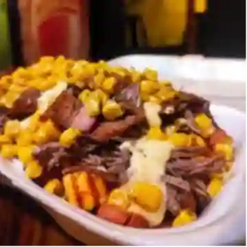 1250gr papa 100% artesanal, Maíz dulce, pollo desmechado, carne desmechada, salchicha americana, papas chip, mezcla de quesos, tocineta, chorizo 100% res y salsas de la casa (maiz, leña, bbq y tomate).