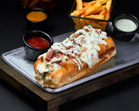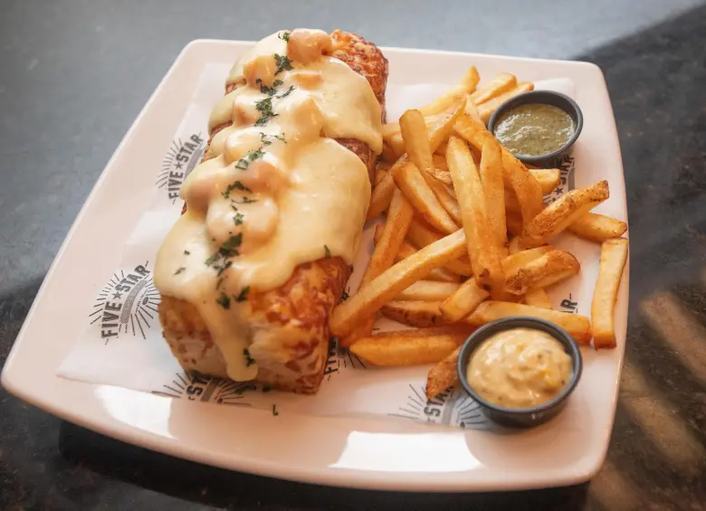 Pan artesanal, carne desmechada, pollo desmechado, salchicha americana, tocineta, jamón, lechuga, cebolla encurtida, maíz tierno, mezcla de quesos de la casa (mozzarella y cheddar), salsas (tomate, mayonesa y mostaza) y acompañado de papas a la francesa artesanales.