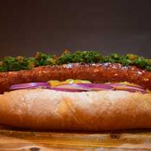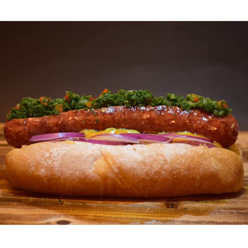 Pan artesanal, chorizo 100% res artesanal, chimichurri, guacamole, queso cheddar, papa chip y cebolla encurtida.