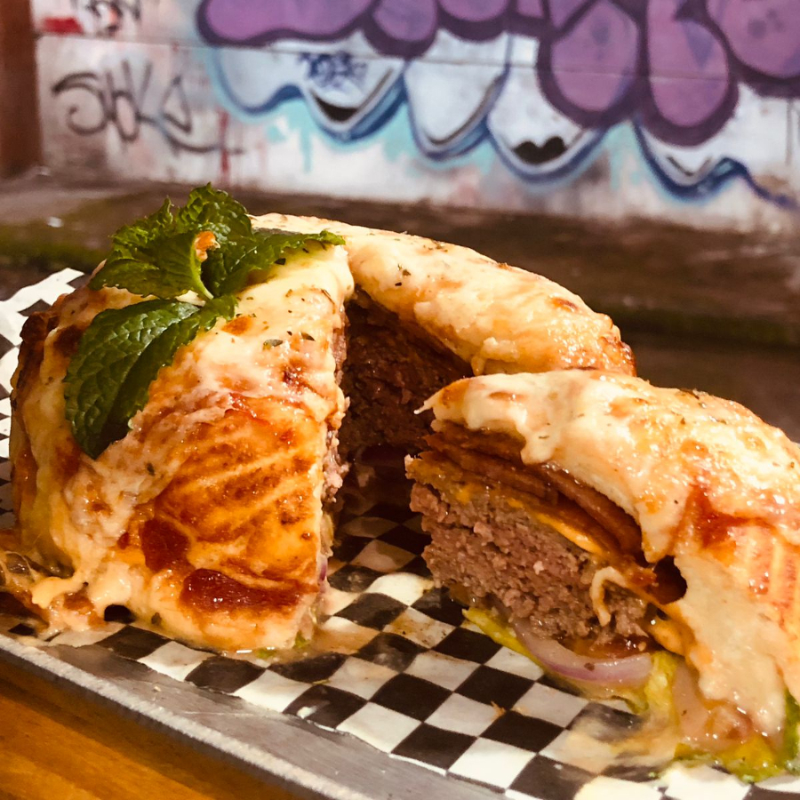 150 g de res artesanal, 2 tocinetas, jamón, queso cheddar, lechuga, tomate, cebolla encurtida y salsas de la casa (tomate, mayonesa y mostaza), envuelta en masa madre madura, pasta de tomate y queso gratinado con papas a la francesa artesanal.