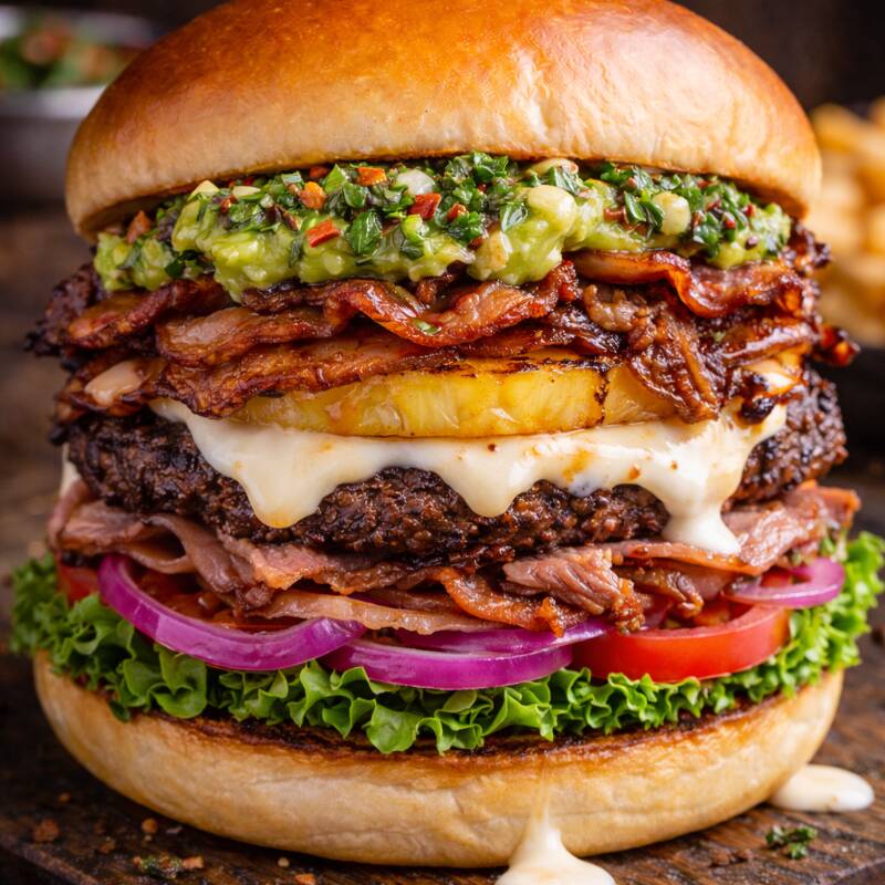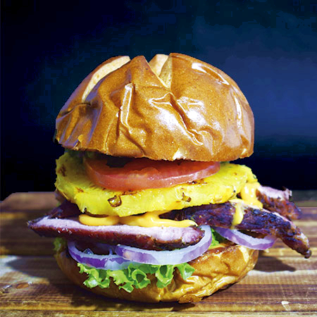 Pan brioche, 130gr bondiola de cerdo, carne 100% res de 150 g, doble tocineta, piña asada, queso cheddar, lechuga, tomate, cebolla encurtida y salsas de la casa(chimichurri, bbq y mostaza), con papa a la francesa artesanal y gaseosa.
