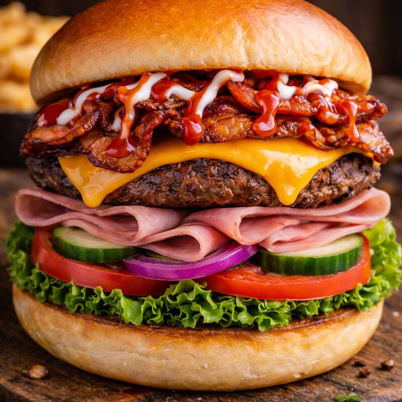 Pan brioche parmesano, 2 carnes de 150 g, doble tocineta, queso cheddar, lechuga, tomate, cebolla encurtida y salsas (tomate, mayonesa y mostaza).