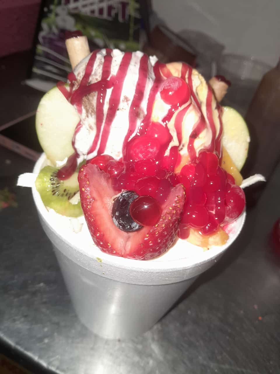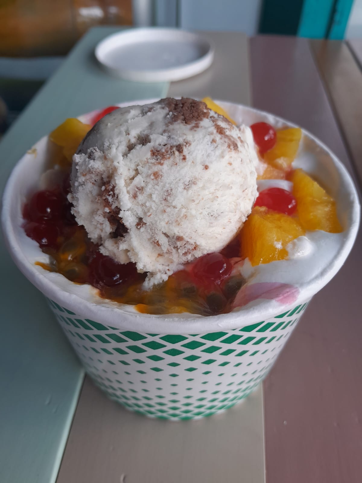 3 Frutas, 2 toppings y 1 bola de helado.