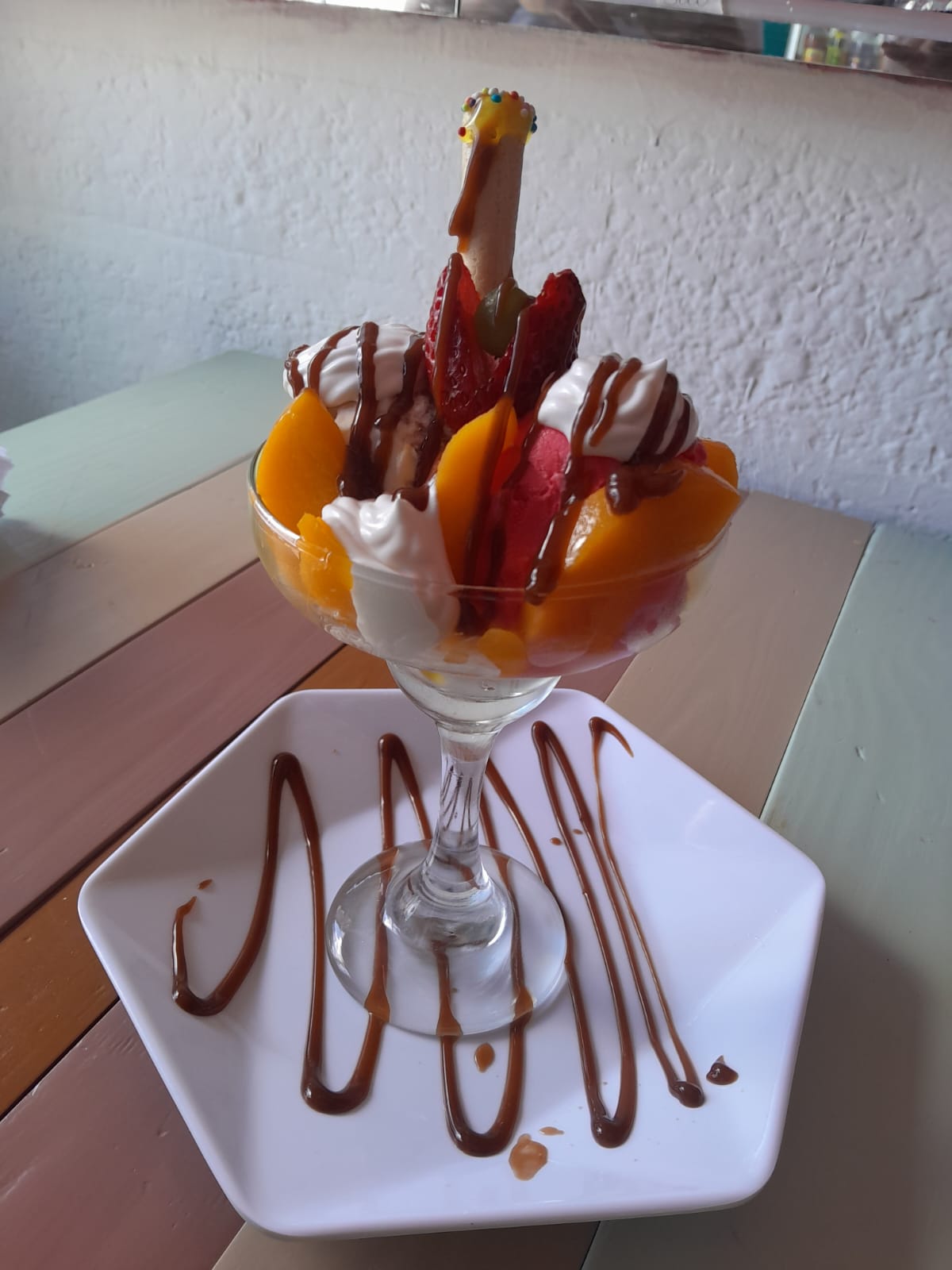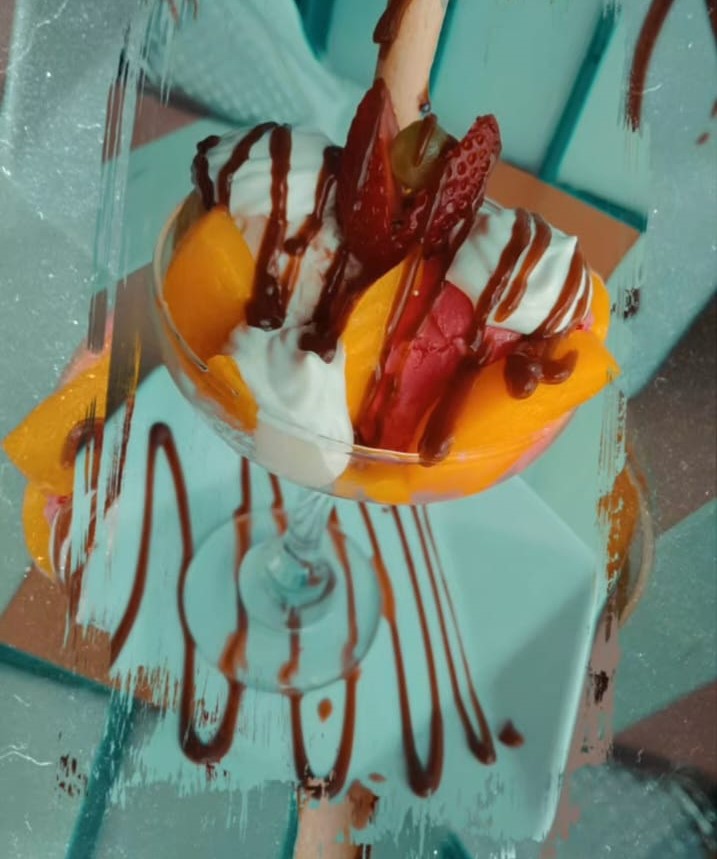 Copa con dos bolas de helado durazno Chantilly salsa