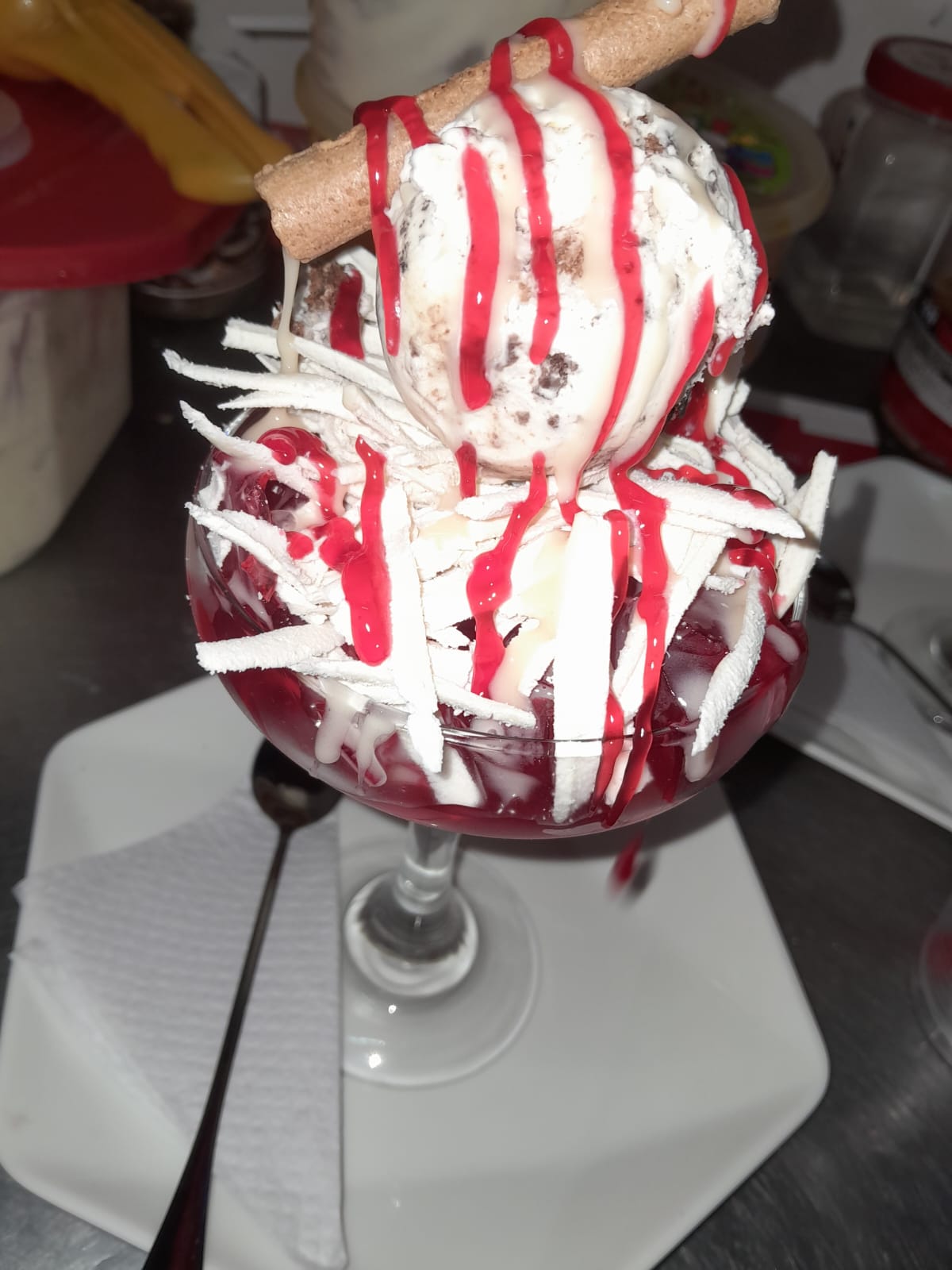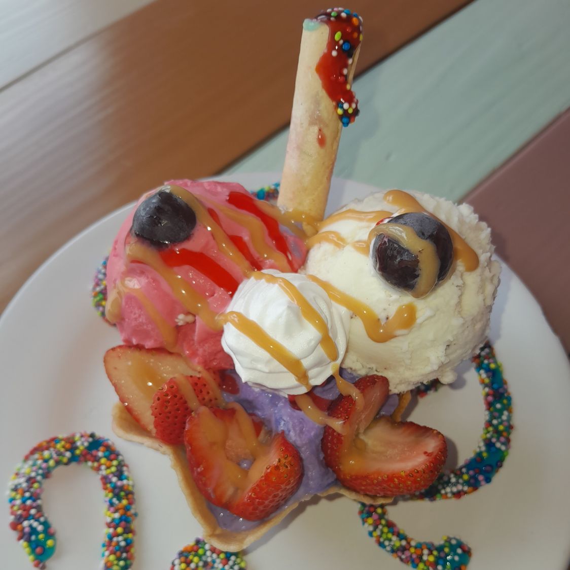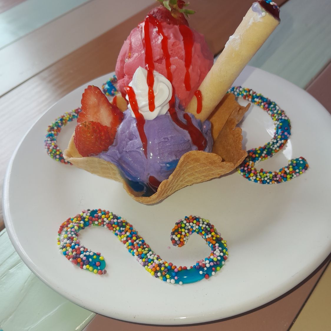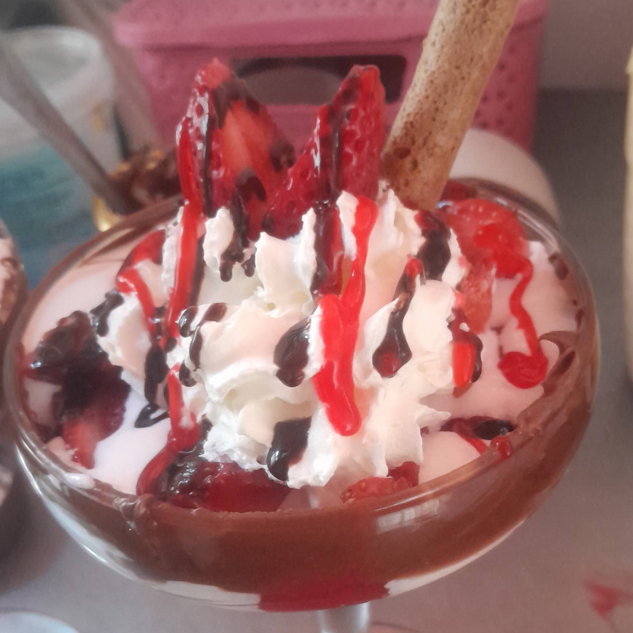 Helado, crema, barquillos, fresa y chispa de colores.