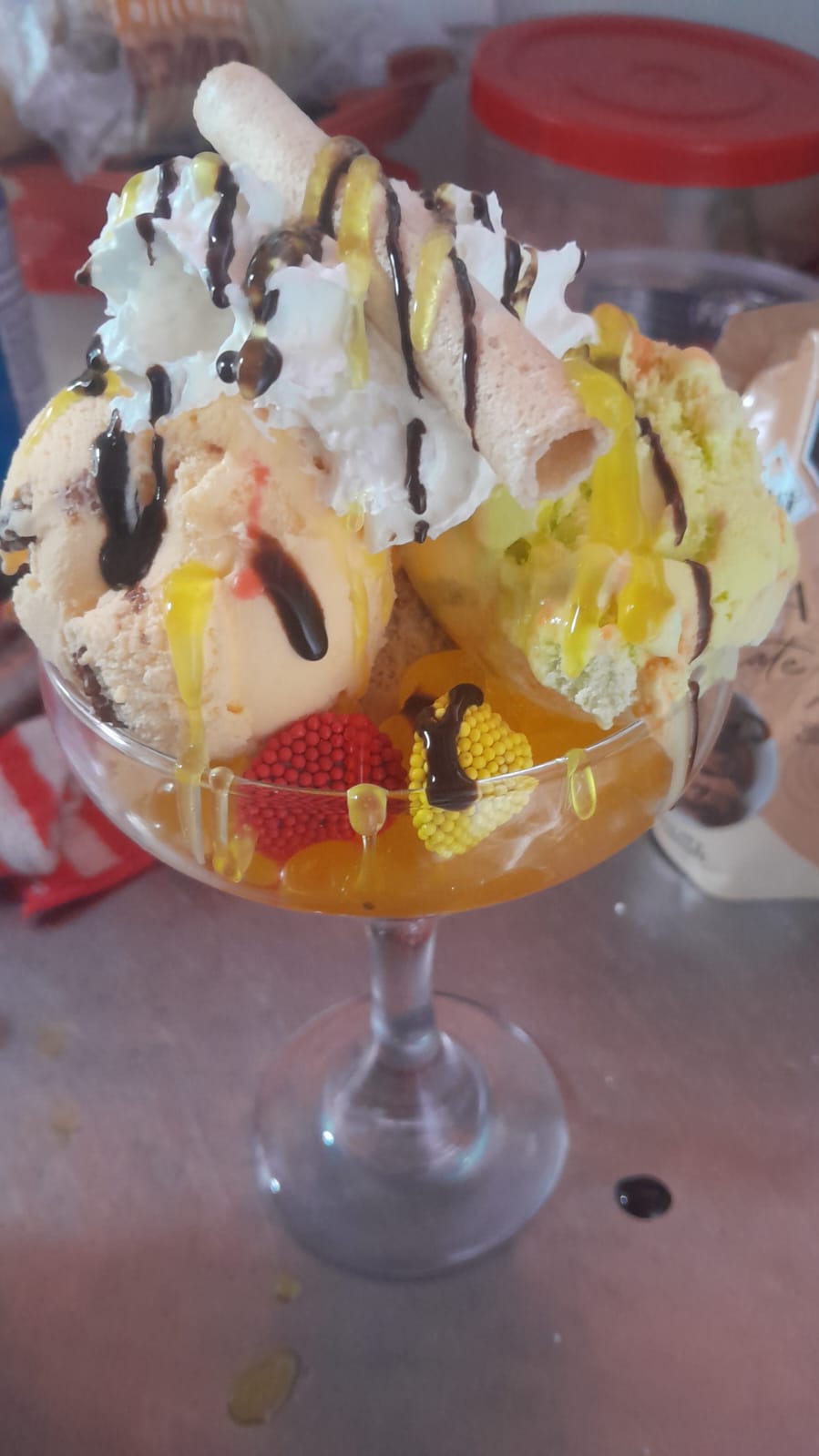 Miel,fresa,banano,salsa de chocolate,gomita,mym,morita, Ore triturado y cereza