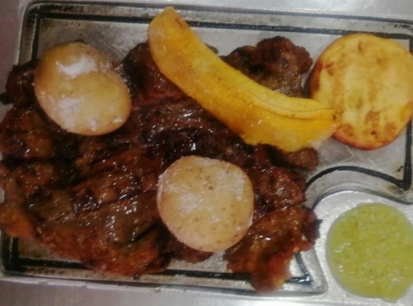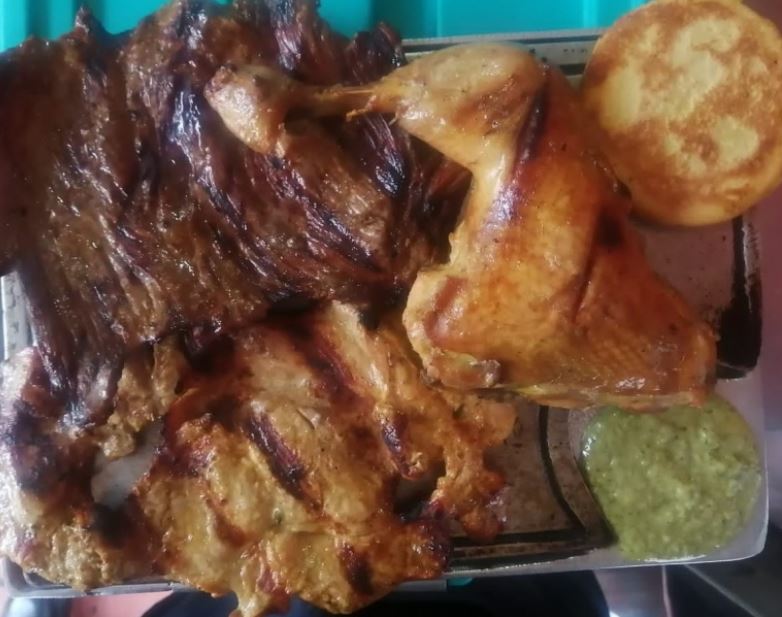 Platillo individual: carne a la parrilla con 3 tipos de carne (res, cerdo y pollo), acompañada de papa salada o papas a la francesa, arepa boyacense, aguacate o ensalada, arroz, jugo del día (12 oz) o limonada, y sopa, crema o fruta.