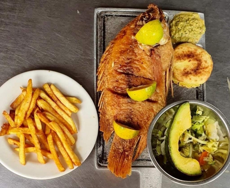Mojarra fresca preparada a la brasa, acompañada de papa salada o francesa, arepa boyacense, aguacate, arroz, jugo del día o limonada y sopa, crema o fruta.