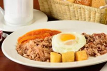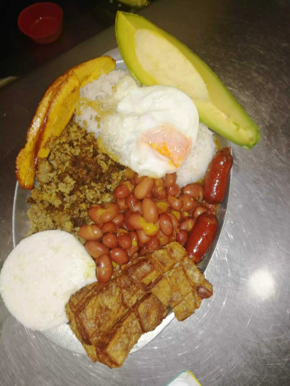 Bandeja paisa especial con arroz, chorizo, frijoles, carne molida, tajadas de plátano, arepa, chicharrón, huevo frito, (chorizo) y aguacate. Acompañado de jugo del día o limonada y sopa o crema, fruta.