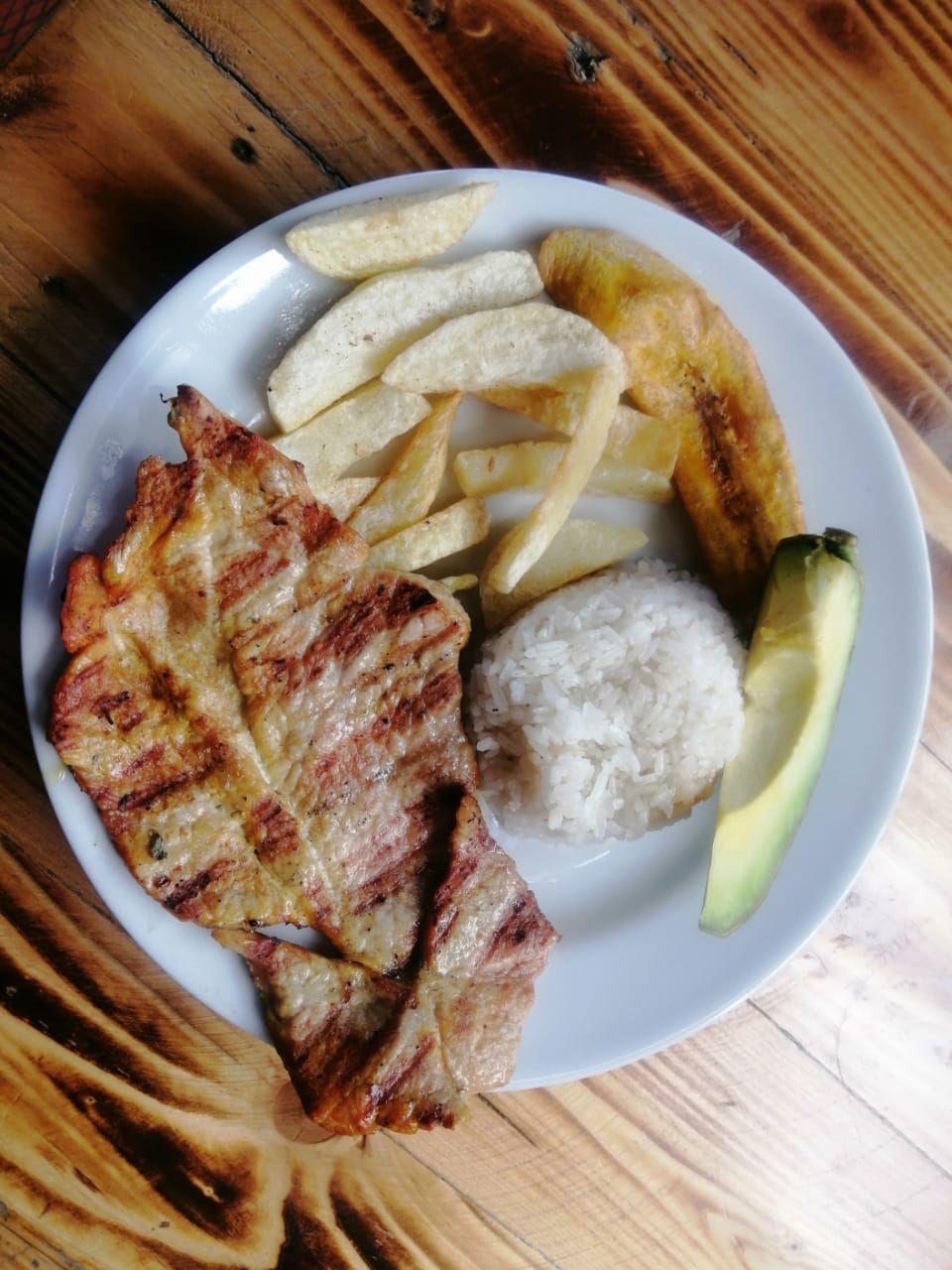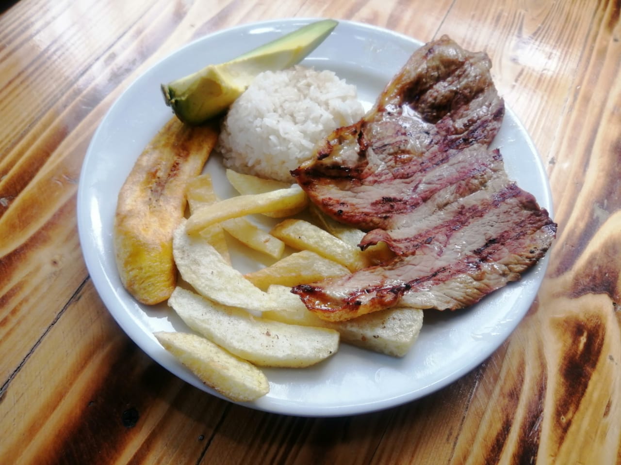Carne a la parrilla, arroz, papa francesa, plátano maduro y aguacate