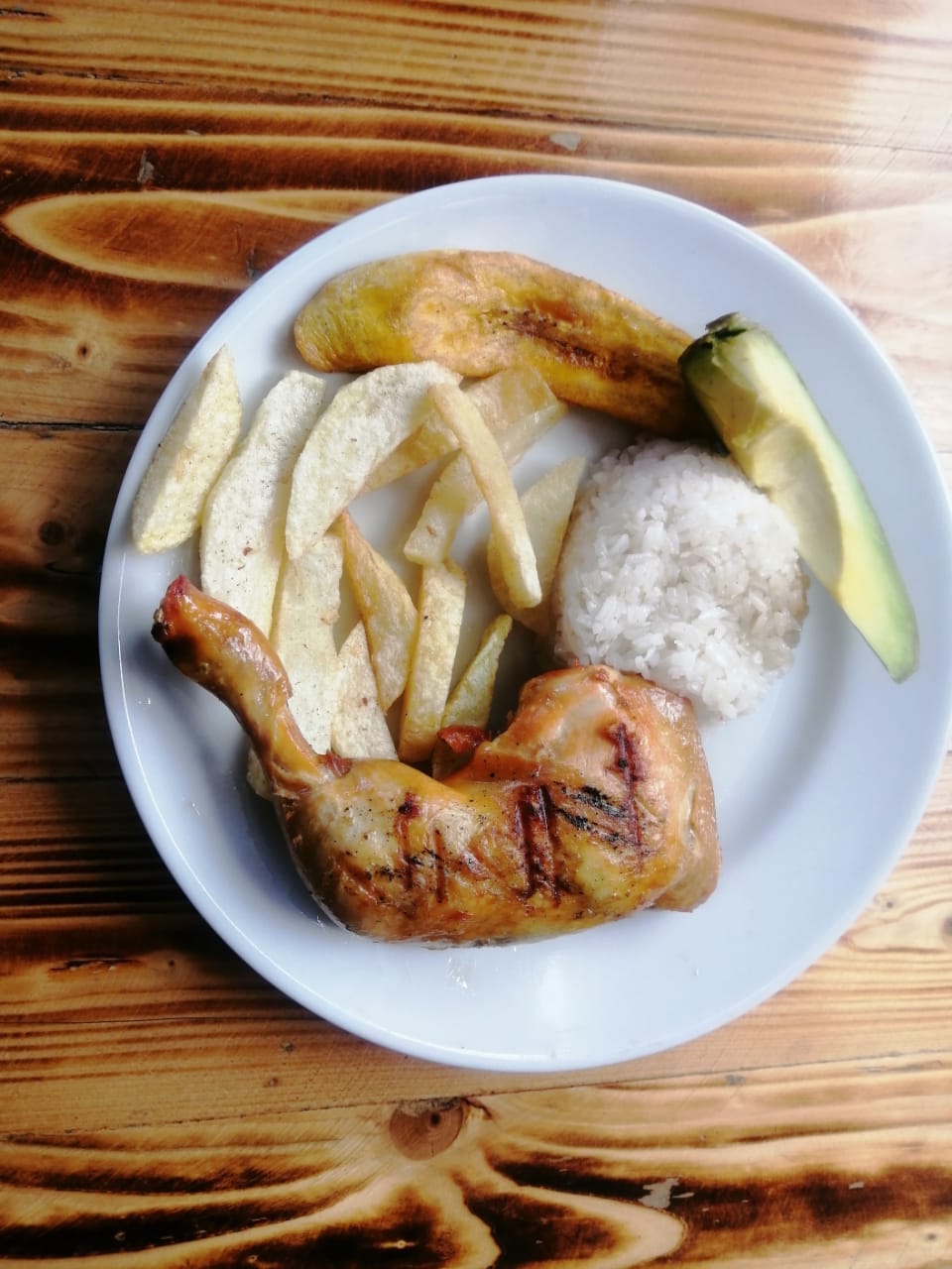 Pechuga a la parrilla, arroz, papa francesa, plátano maduro y aguacate.