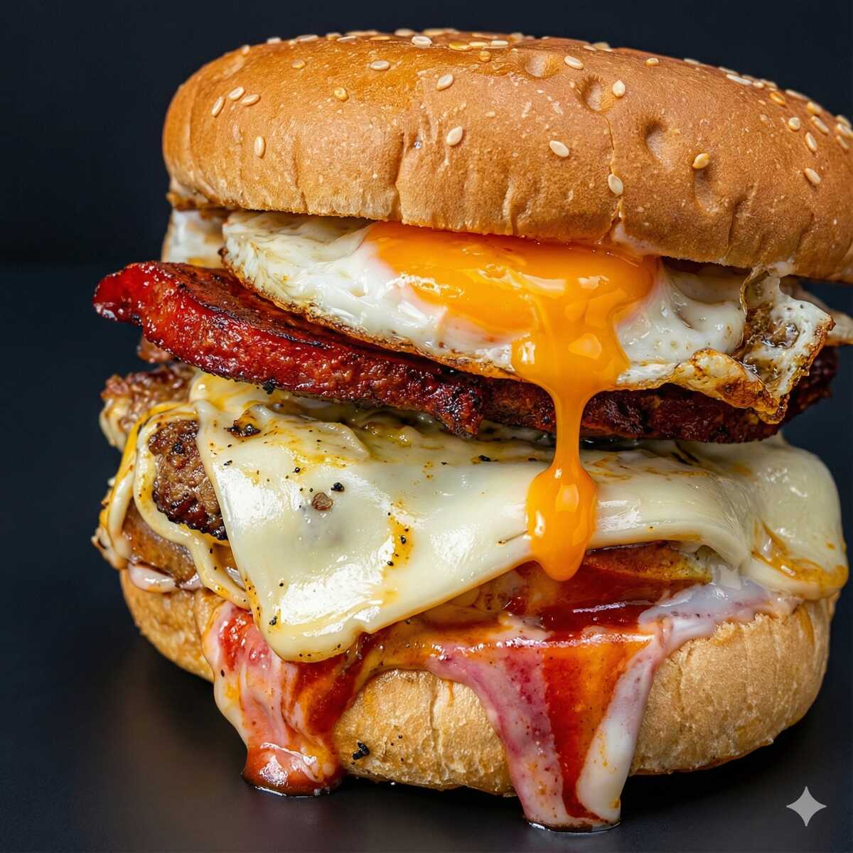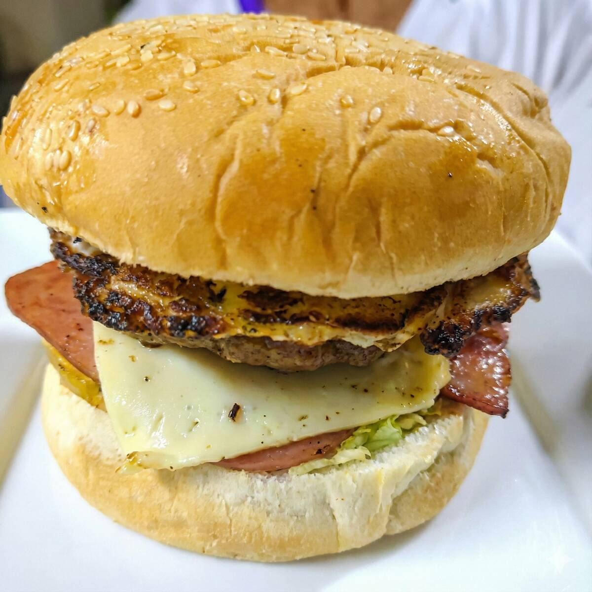 2 Carnes de res artesanal de 125gr, pan, lechuga, tomate, cebolla al gusto (cruda o cocida), papas chips, jamón, tocineta, doble queso tajado y salsas de la casa.