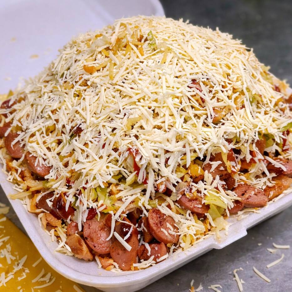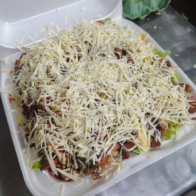 Carne de res y pollo a la plancha, chorizo artesanal, chuleta ahumada, papas chips, jamón, tocineta, triple queso tajado y salsas de la casa.