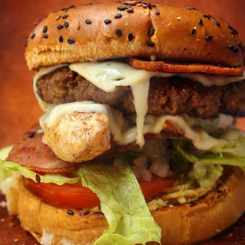 Carne de res y pollo a la plancha, pan, lechuga, tomate, cebolla al gusto (cruda o cocida), papas chips, jamón, tocineta, doble queso tajado y salsas de la casa.
