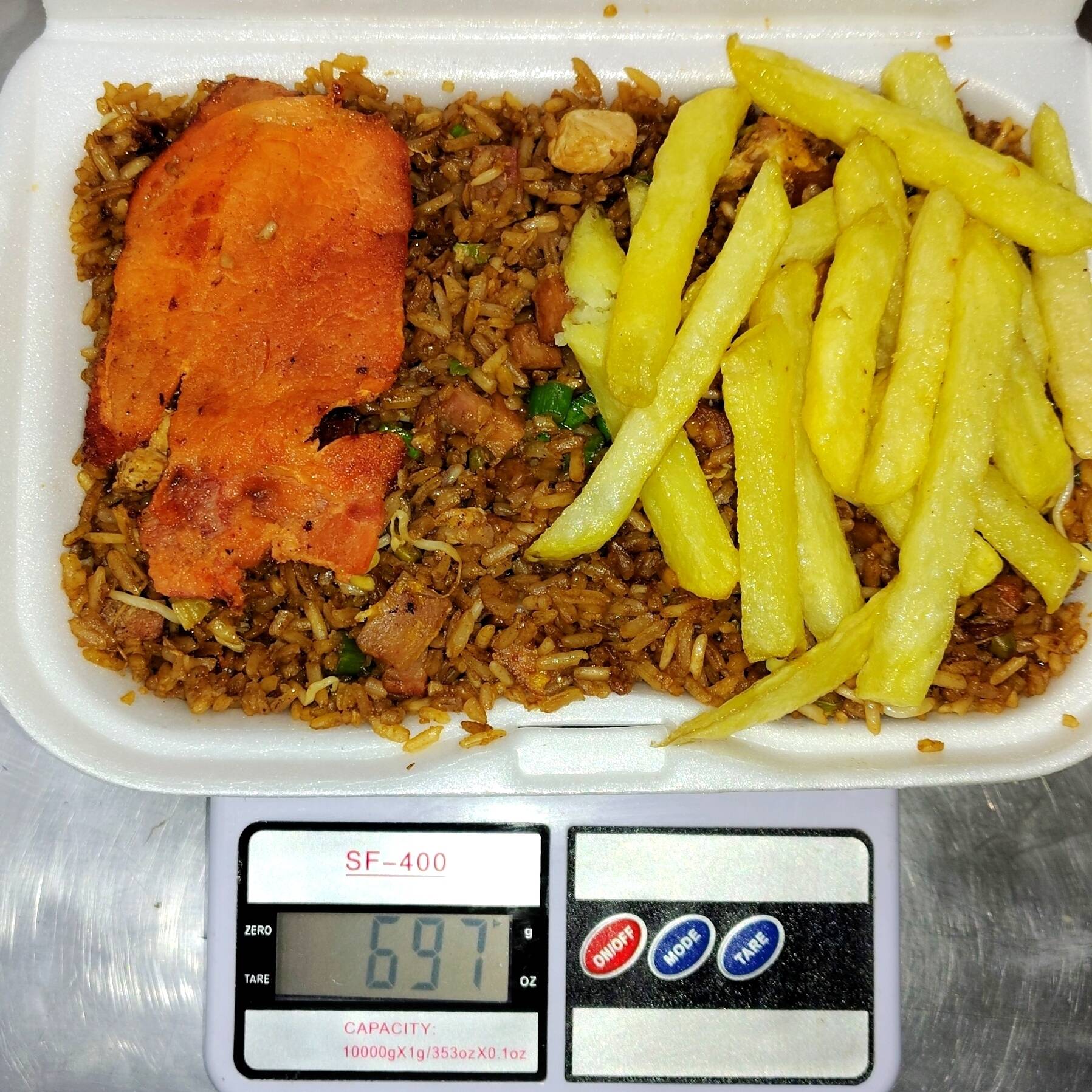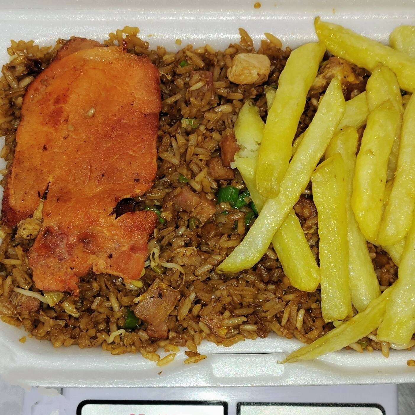 Arroz con mixtas pollo y cerdo acompañado de papas francesa y alita frita