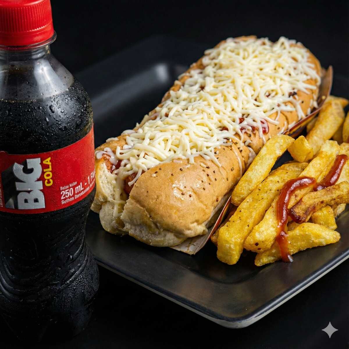 Salchicha de pollo, pan, cebolla (cruda o cocida), papas fosforito, queso y salsas de la casa más gaseosa 250 ml