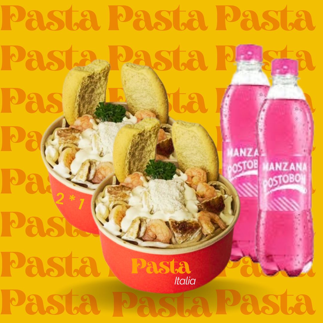 2 Pasta larga en exquisita salsa blanca salteada con pollo y camarones, queso parmesano, serv pan tostado, 2 gaseosa Postobón 250 ml.