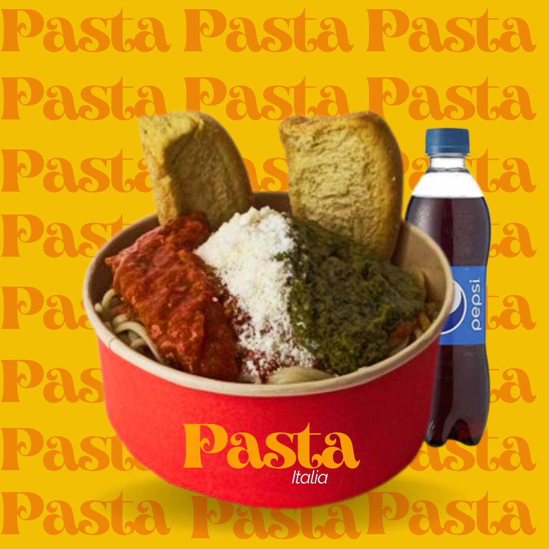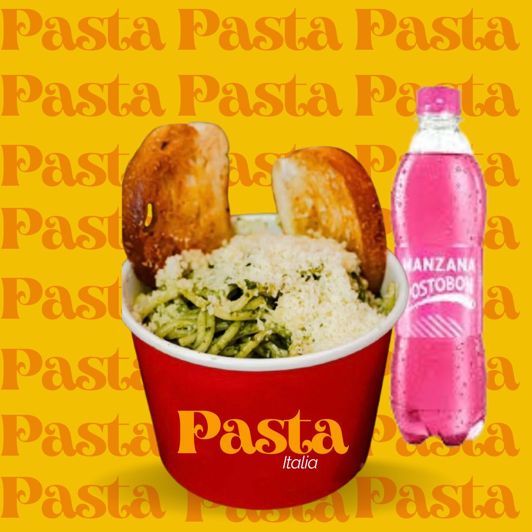 Pasta larga con exquisita salsa pomodoro combinada con salsa pesto y queso parmesano serv de pan tostado, gaseosa Postobón 250 ml.