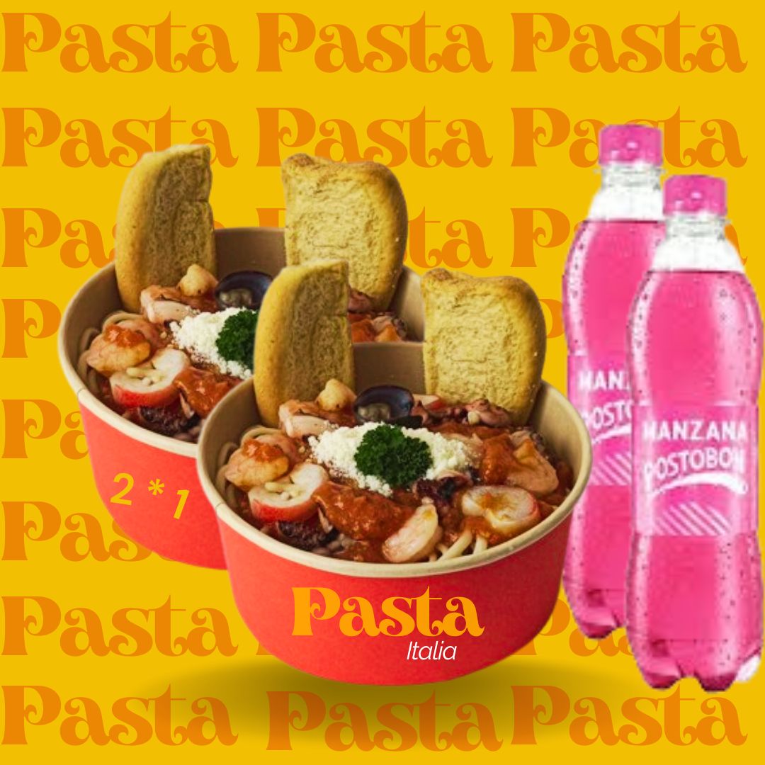 2 Pastas largas en salsa pomodoro salteada con mixtura de mariscos, 2 serv de pan tostado, queso parmesano, 2 gaseosa Postobón 250 ml.
