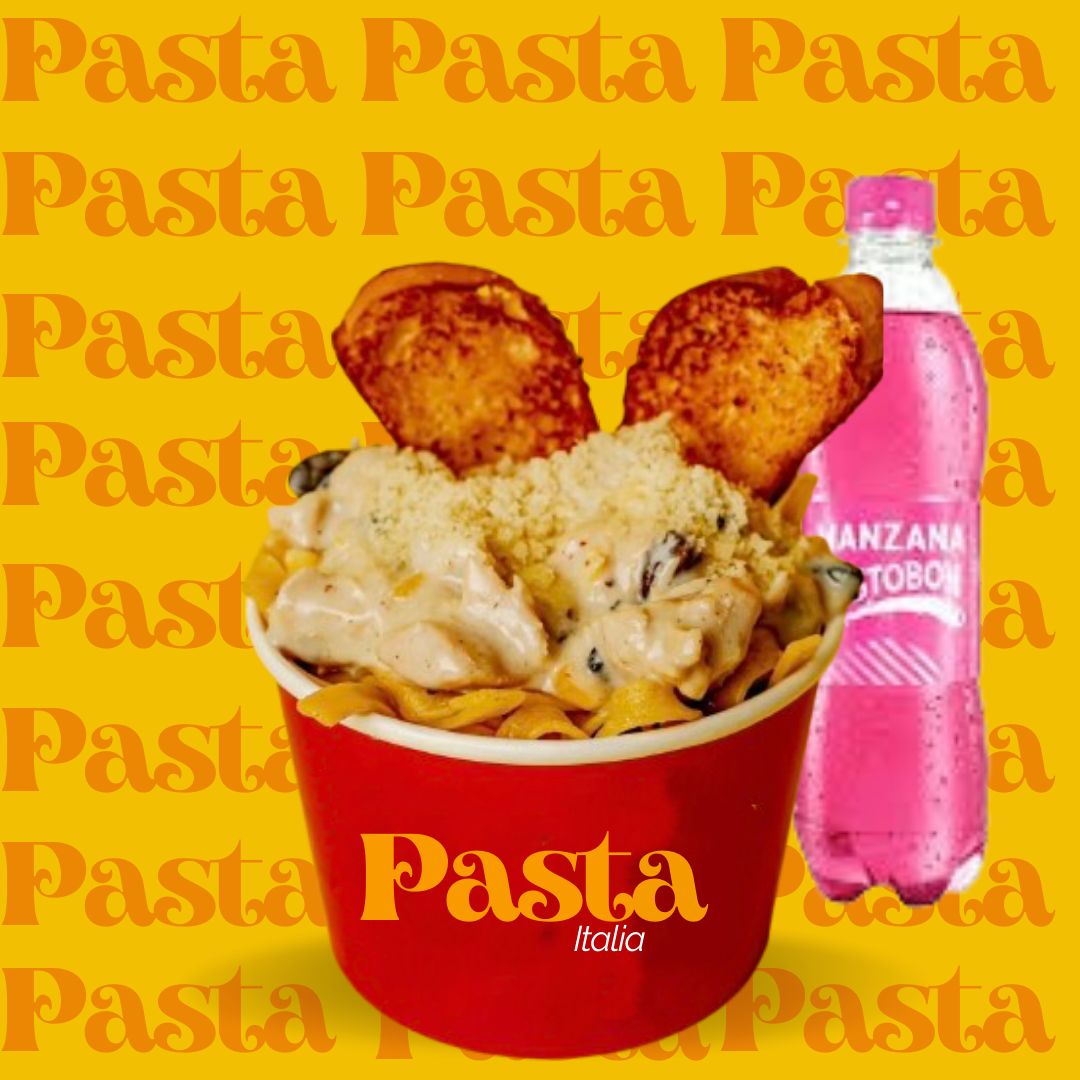 Pasta larga con exquisita salsa blanca salteada en pollo y tocineta, queso parmesano, serv de pan tostado, gaseosa Postobón 250 ml.