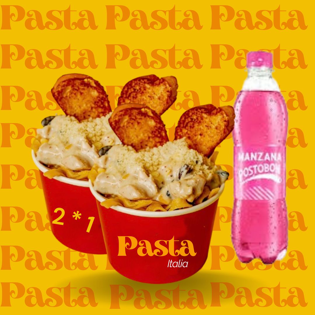 2 Pastas largas con exquisita salsa pomodoro combinada con salsa pesto y queso parmesano, 2 serv de pan tostado, 2 gaseosas Postobón 250 ml.