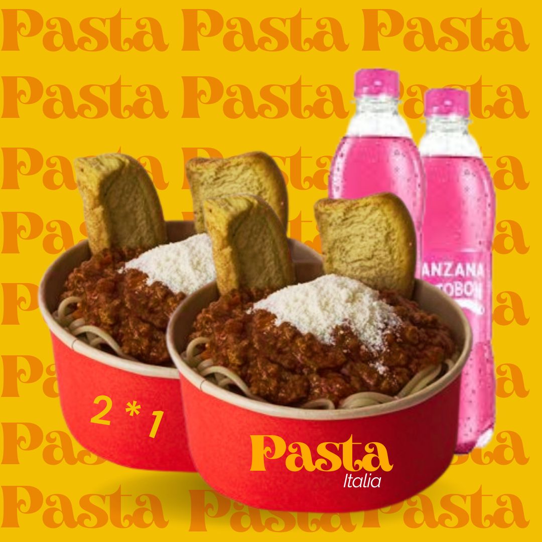 2 Pastas larga con exquisita salsa boloñesa queso parmesano, 2 serv de pan tostado, 2 gaseosa Postobón de 250 ml.