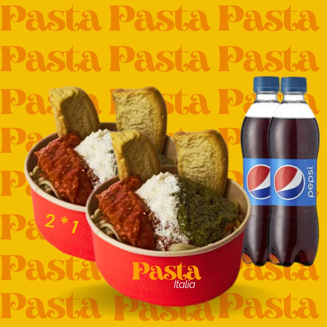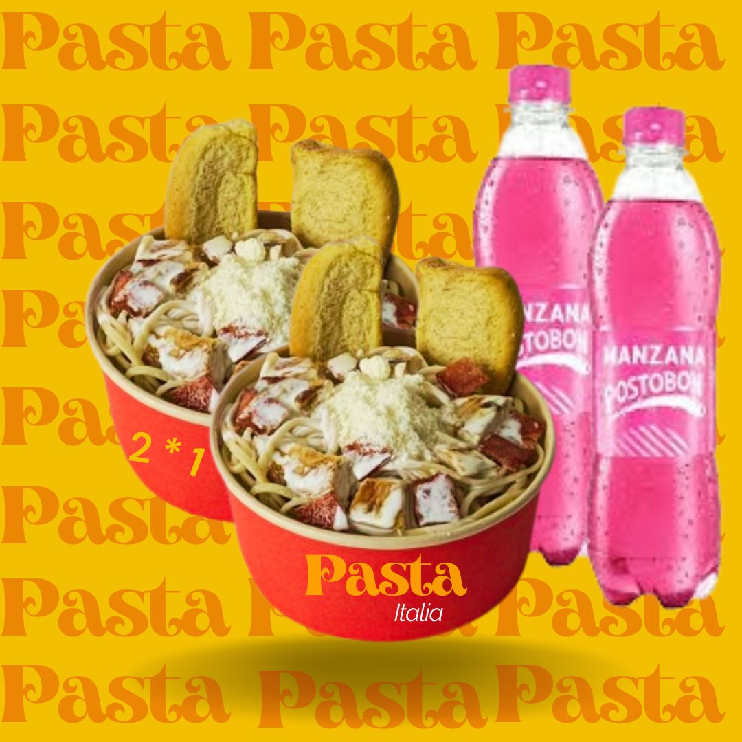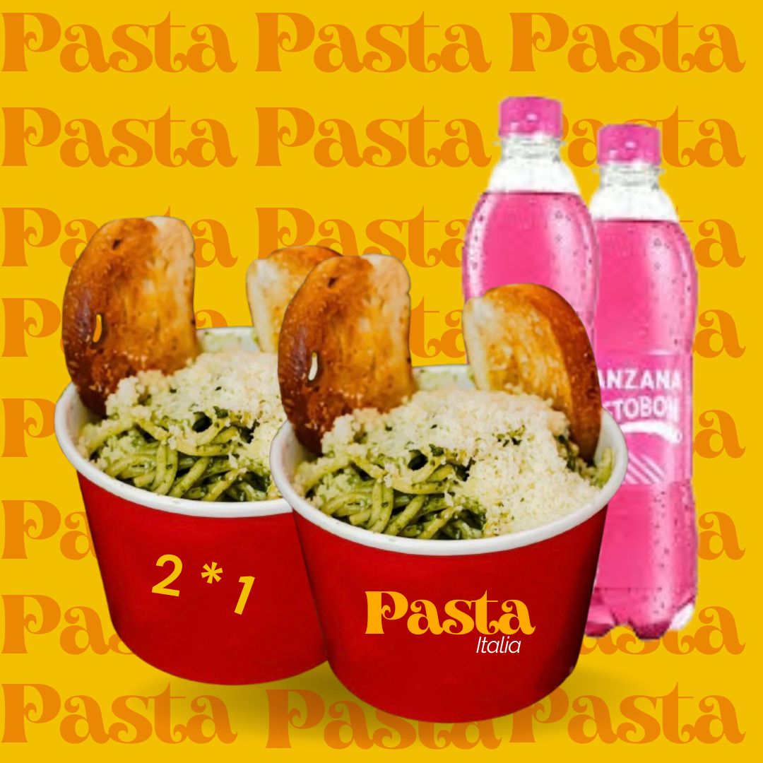 2 Pastas largas con exquisita salsa pomodoro combinada con salsa pesto y queso parmesano 2 serv de pan tostado, 2 gaseosas Postobón 250 ml.