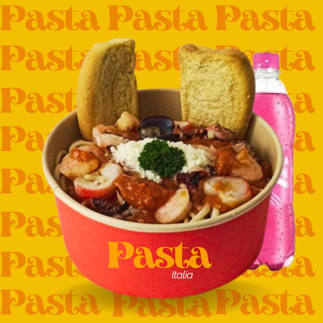 2 Pastas largas en salsa pomodoro salteada con mixtura de mariscos, 2 serv de pan tostado, queso parmesano 2, gaseosa Postobón 250 ml.
