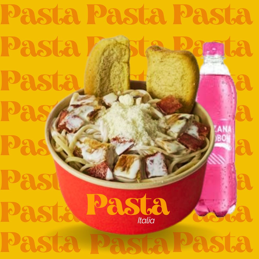 Pasta larga en salsa carbonara tocineta y pollo serv de pan tostado, queso parmesano, gaseosa Postobón 250 ml.