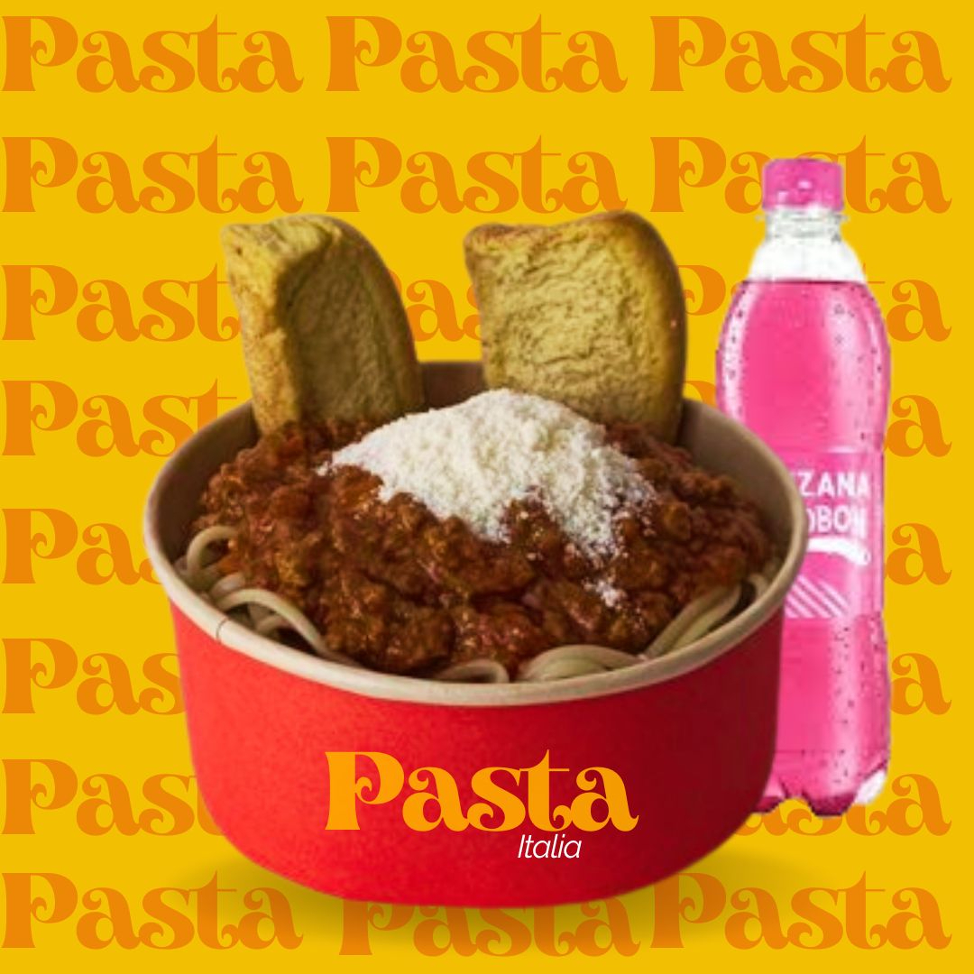 Pasta larga con exquisita salsa pomodoro combinada con salsa pesto y queso parmesano serv de pan tostado, gaseosa Postobón 250 ml.
