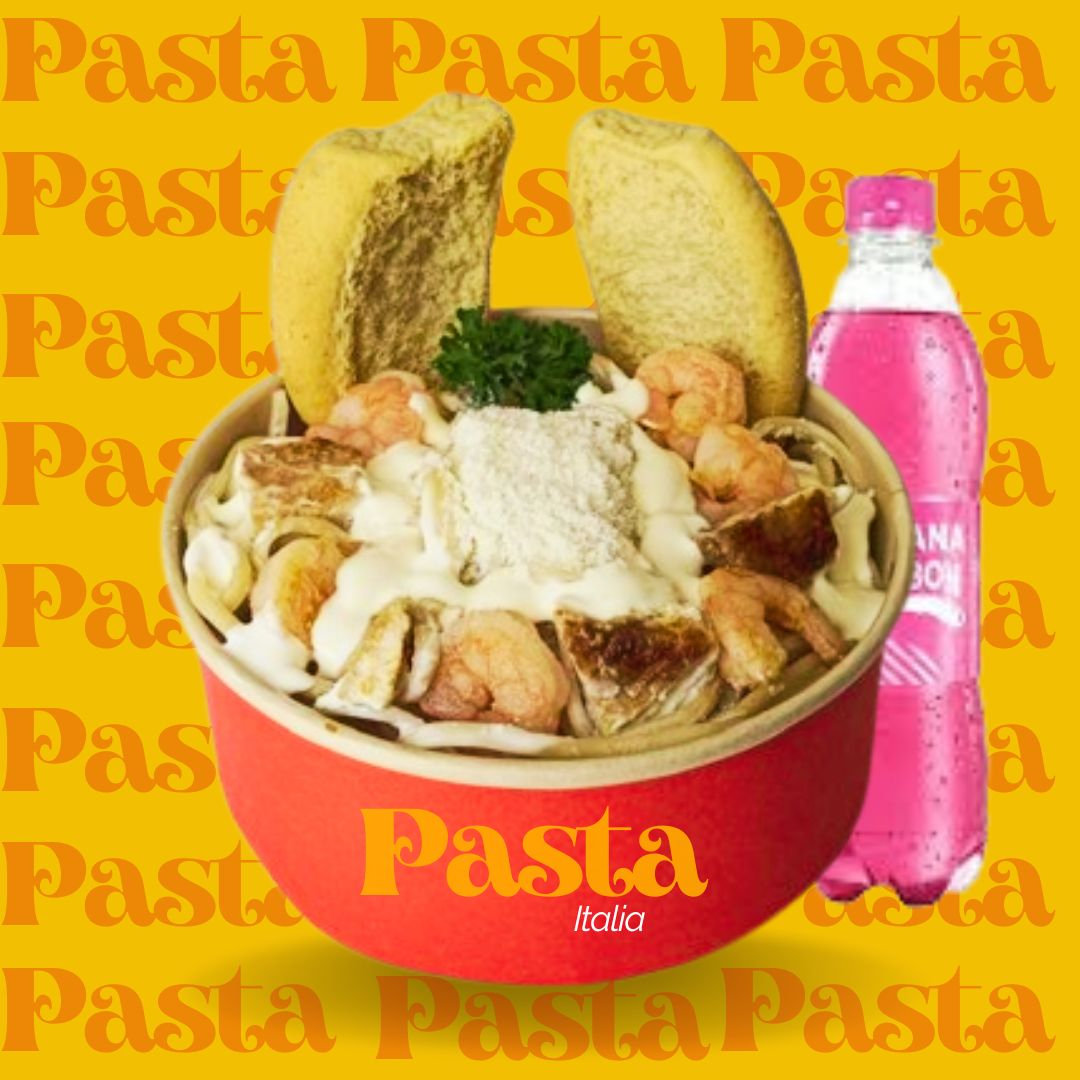 Pasta larga en exquisita salsa blanca salteada con pollo y camarones queso parmesano serv pan tostado, gaseosa Postobón 250 ml .
