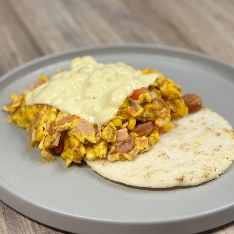 Huevo, cálao, Queso doble Crema, Cebolla y cilantro.