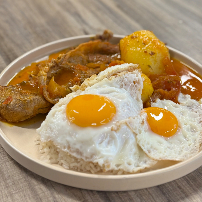 Carne en Bistec, acompañada de arroz, huevo, papa