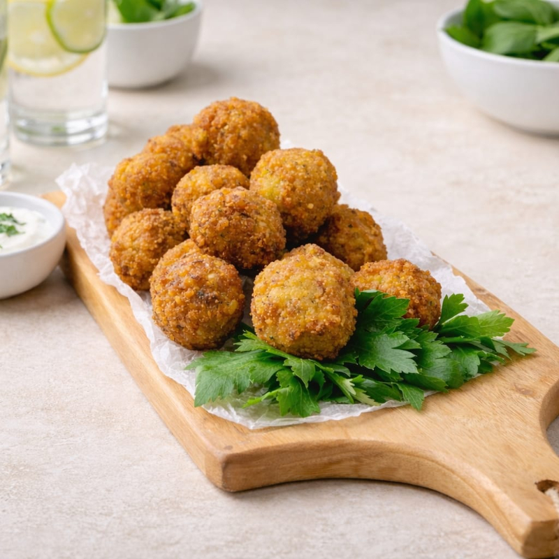 Falafels artesanales hechos a base de garbanzo, especias naturales y hierbas. Producto vegano, crujientes por fuera y suaves por dentro.