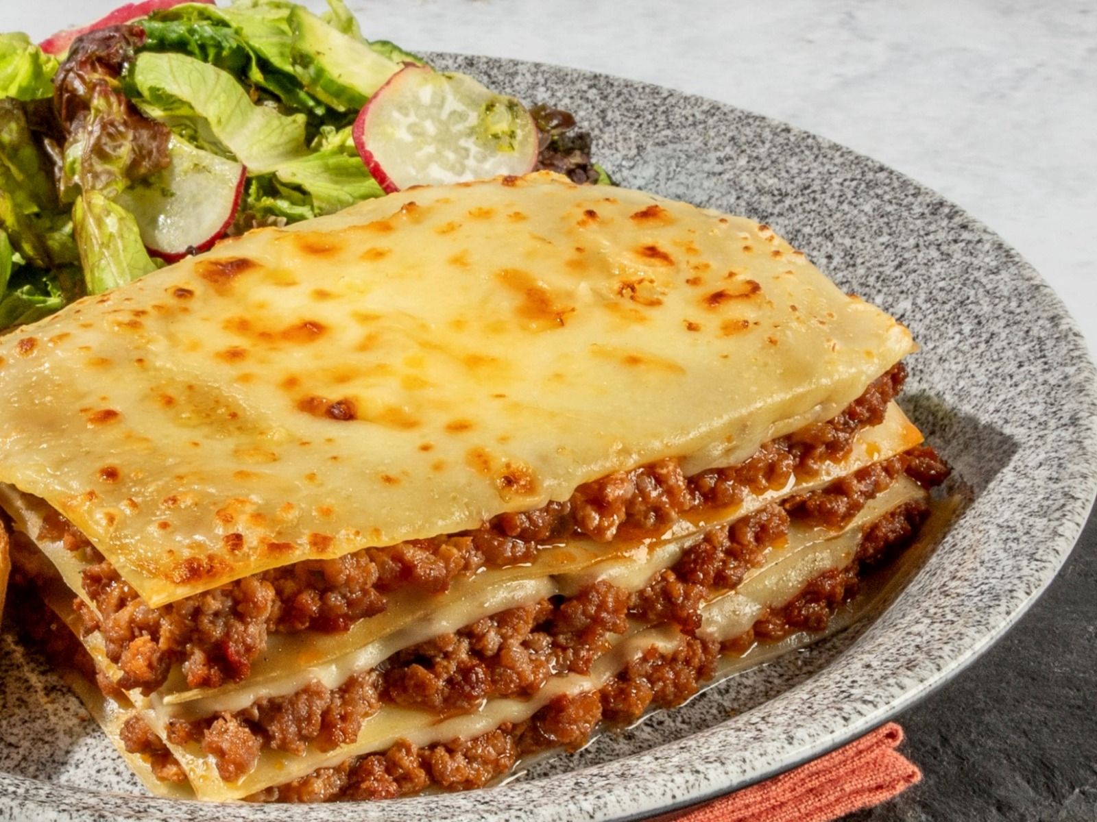 Lasaña de Carne, Acompañada de Ensalada y Vinagreta Verde