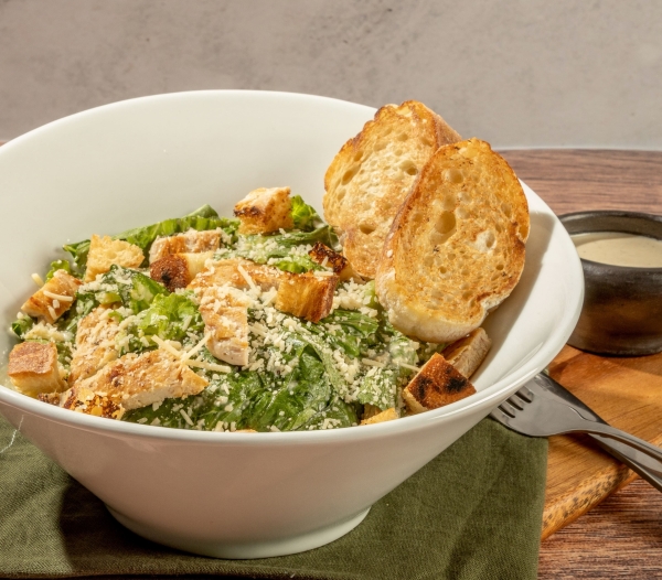 Mezcla de Lechuga Romana y Lechuga Verde Crespa, Queso Parmesano, Crutones, Pollo en Julianas. Acompañada de Aderezo Cesar y Porcion de Pan
