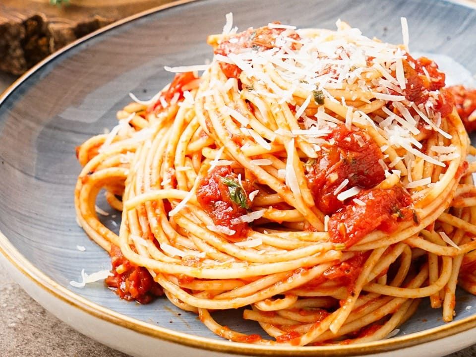 Elige el Tipo de Pasta con Salsa Roja a Base de Tomates Frescos. Acompañado de Pan y Queso Parmesano.