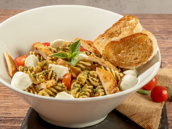 Ensalada con Pasta Tornillo, Salsa Pesto, Tomates Cherry, Queso de Bufala, Pollo en Julianas y Reducccion de Balsamico. Acompañada de Porcion de Pan