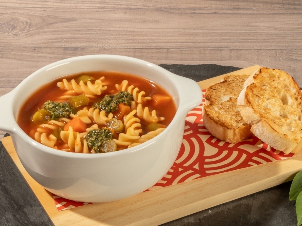 Sopa Tradicional Italiana, con Vegetales y Pasta en Tornillos Acompañada de Porcion de Pan