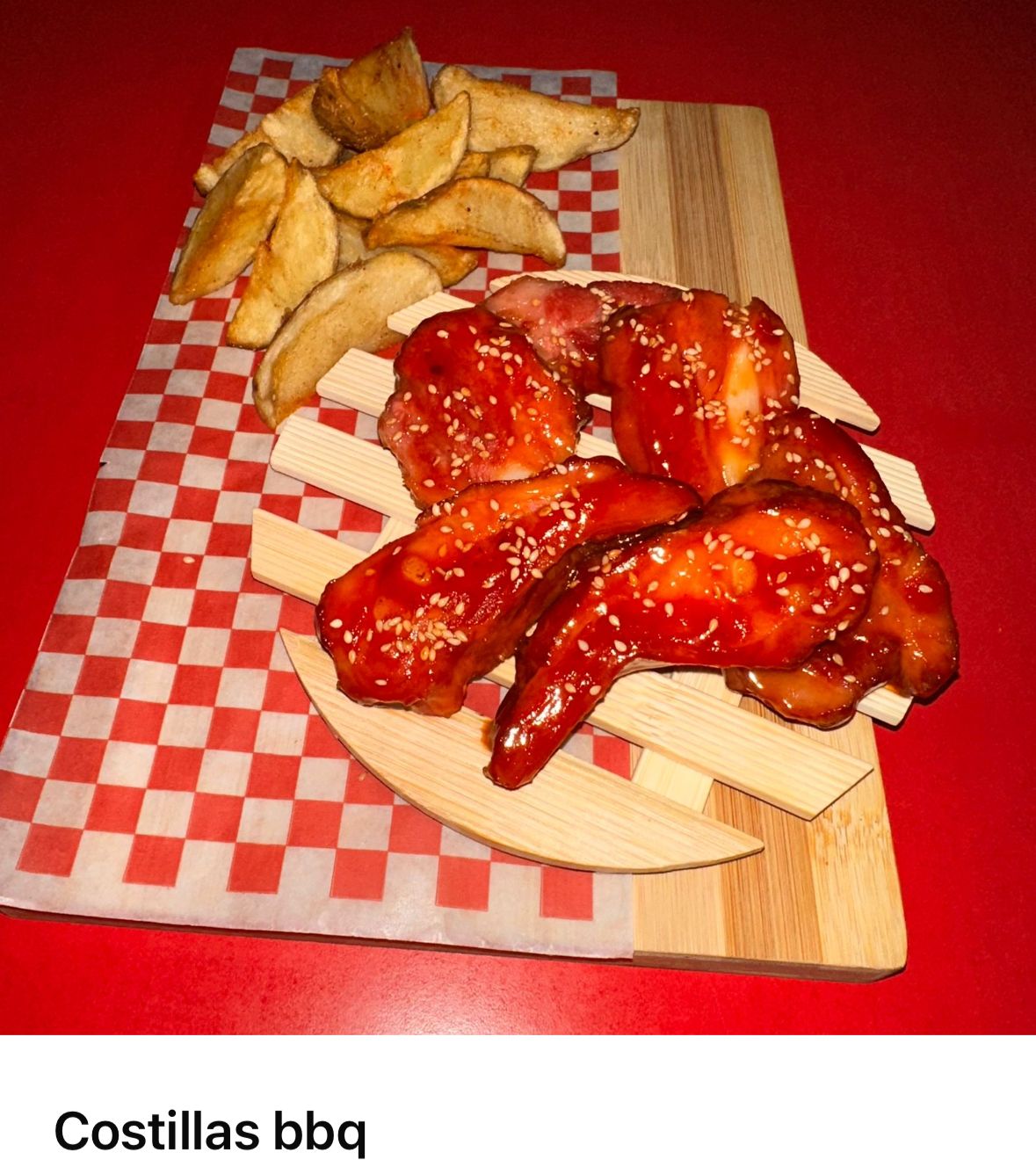 250 g De costillas ahumadas en salsa BBQ, acompañada de papa a la francesa.