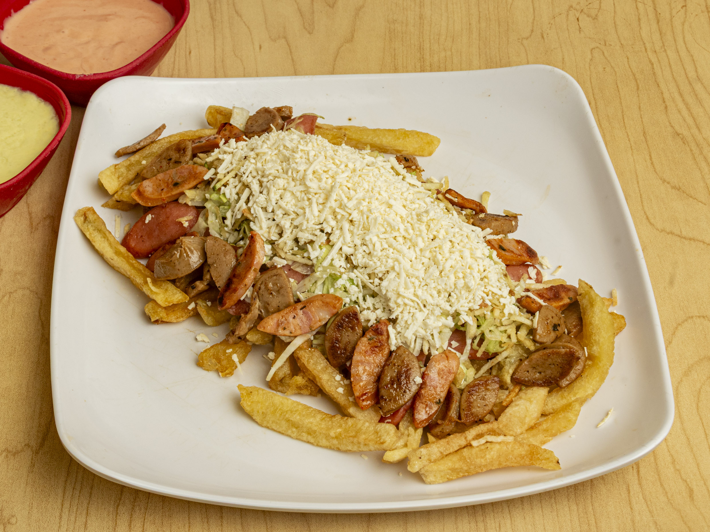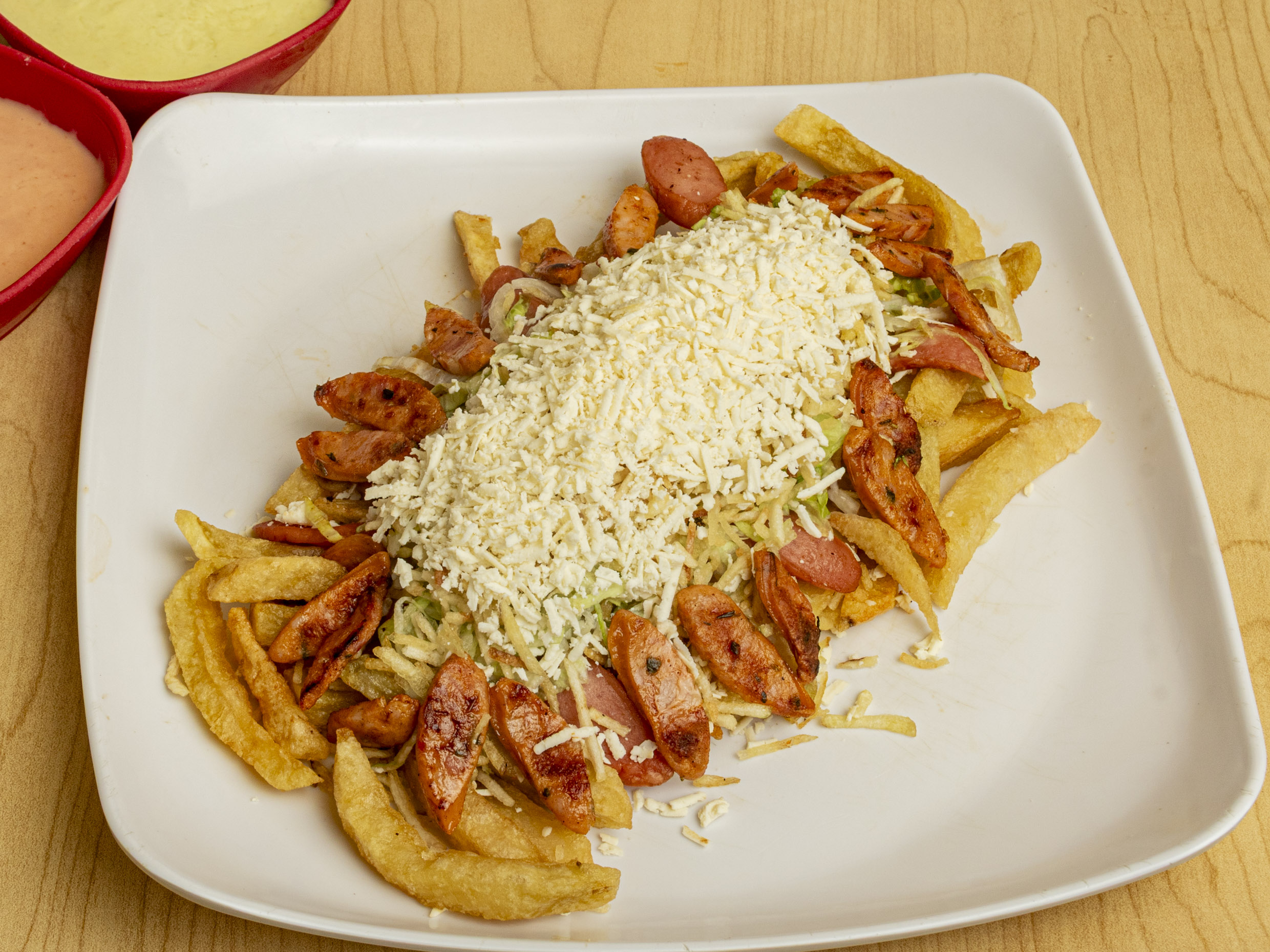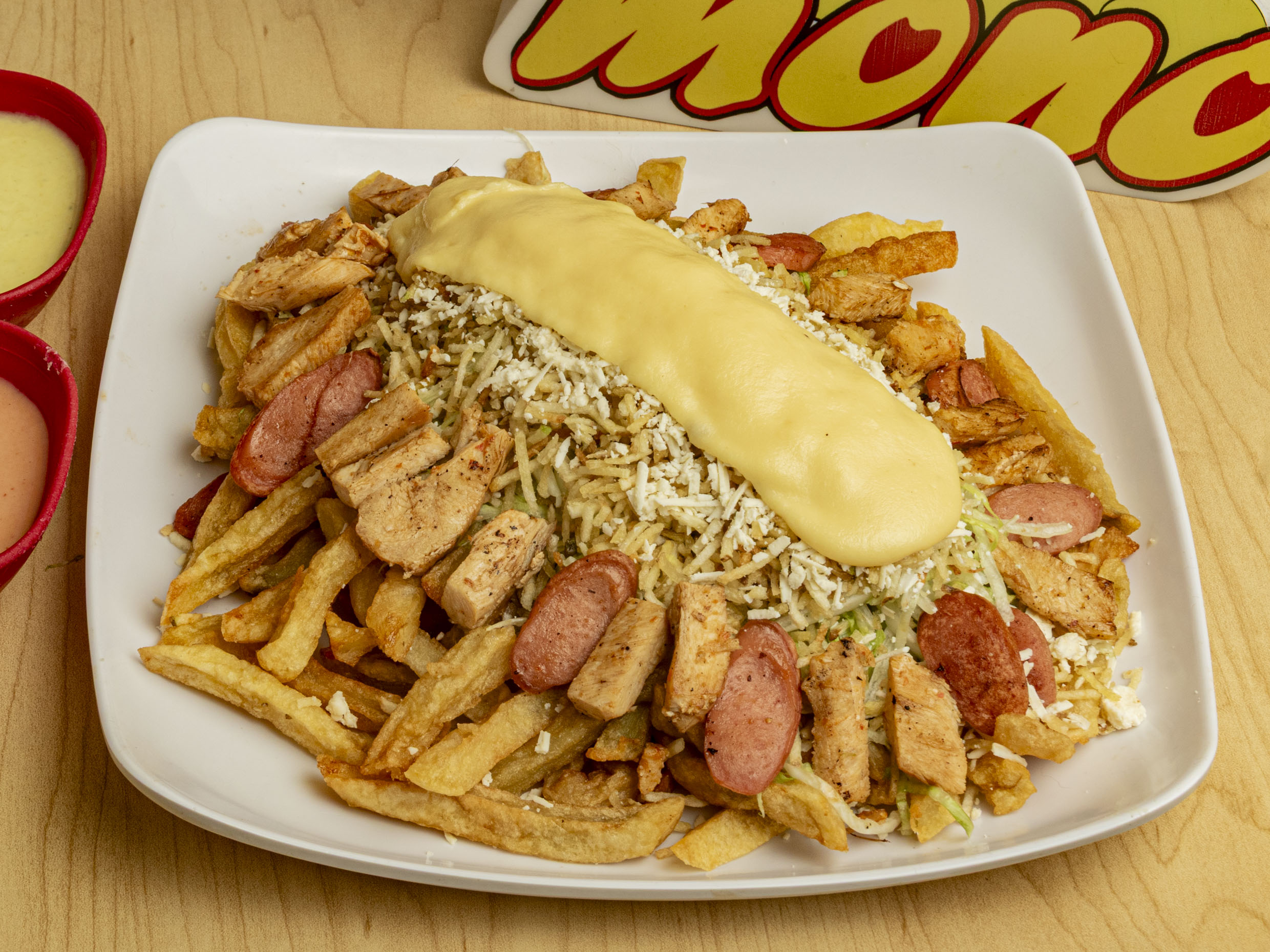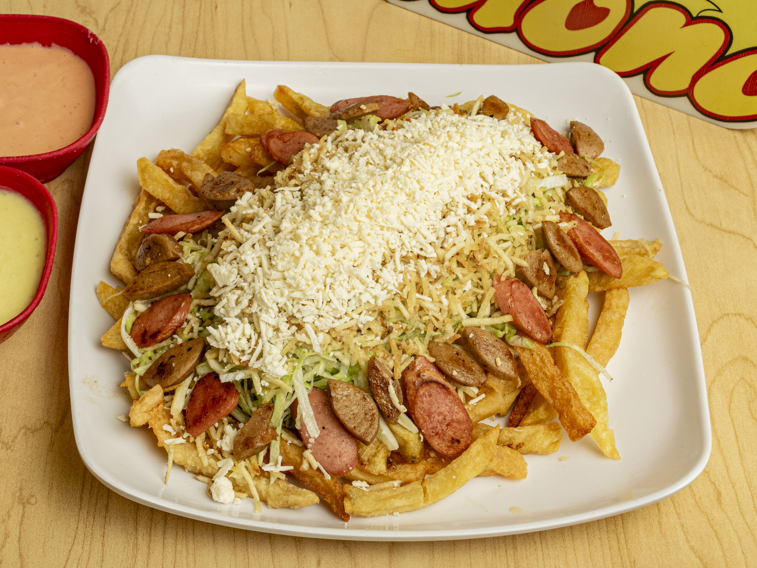 Queso costeño rallado, 150 g de papa a la francesa, lechuga, papa chips, salsa rosada, salchicha Zenú, carne de pollo, chorizo y butifarra (120 g aprox. de proteína).