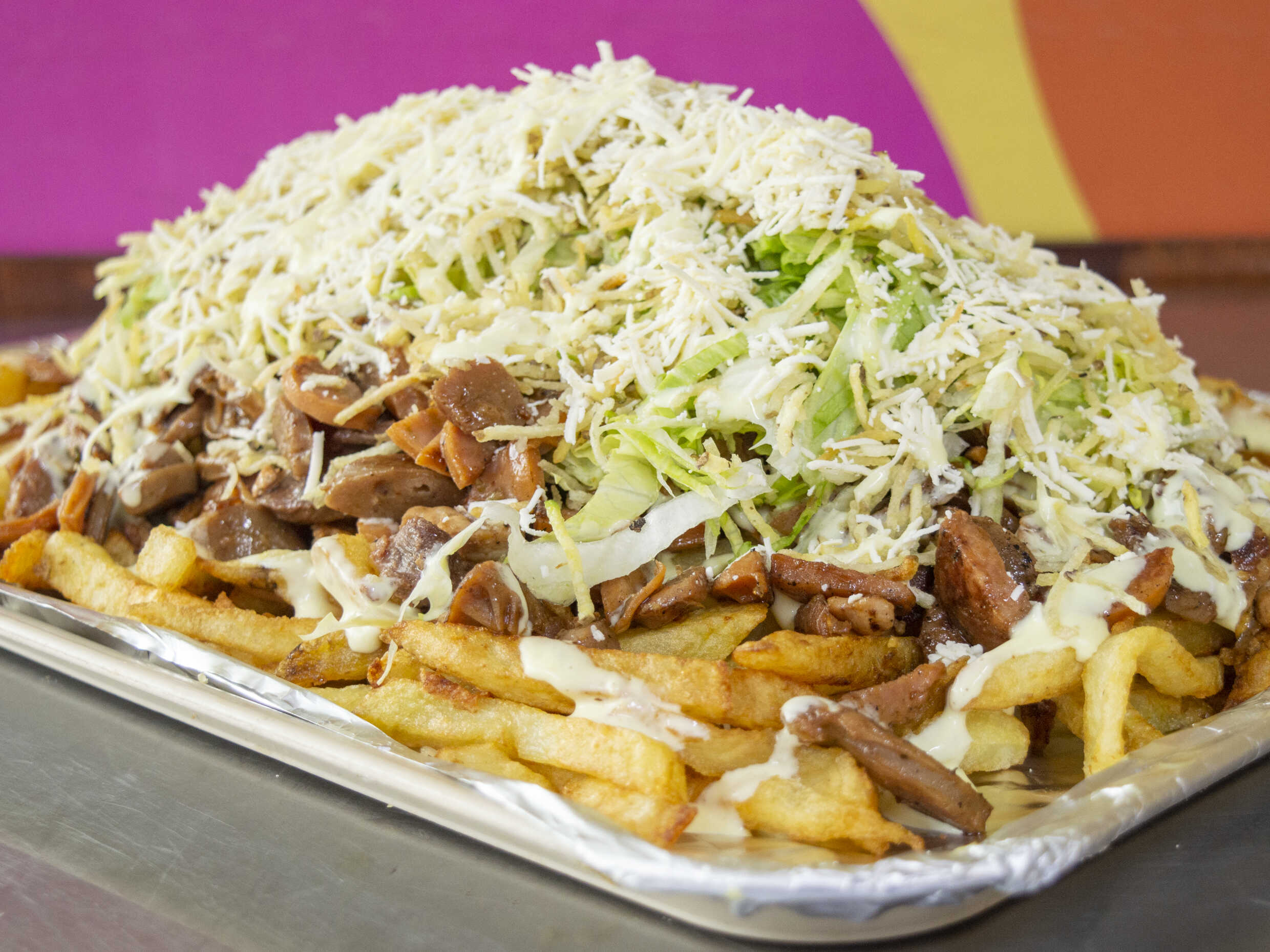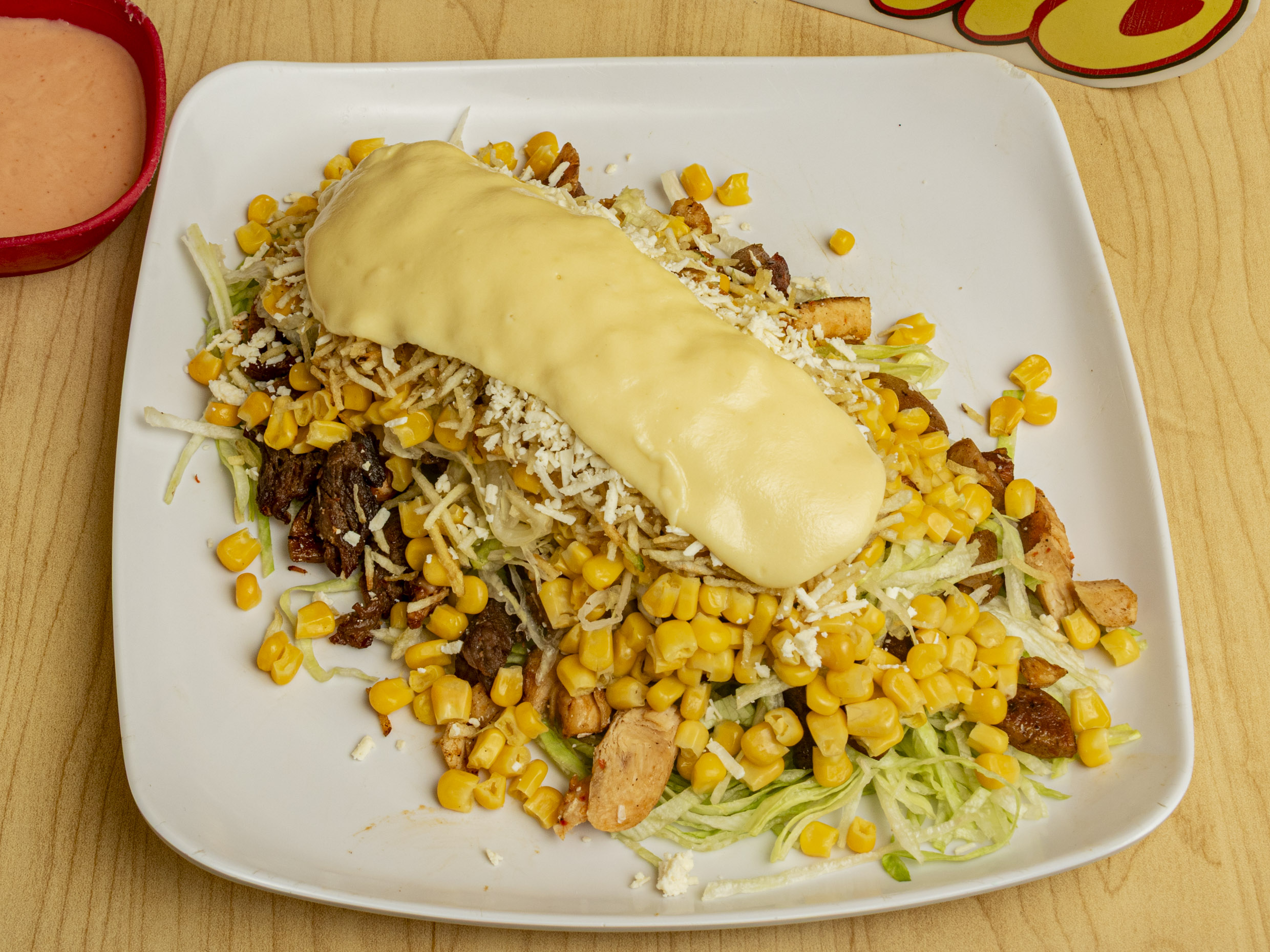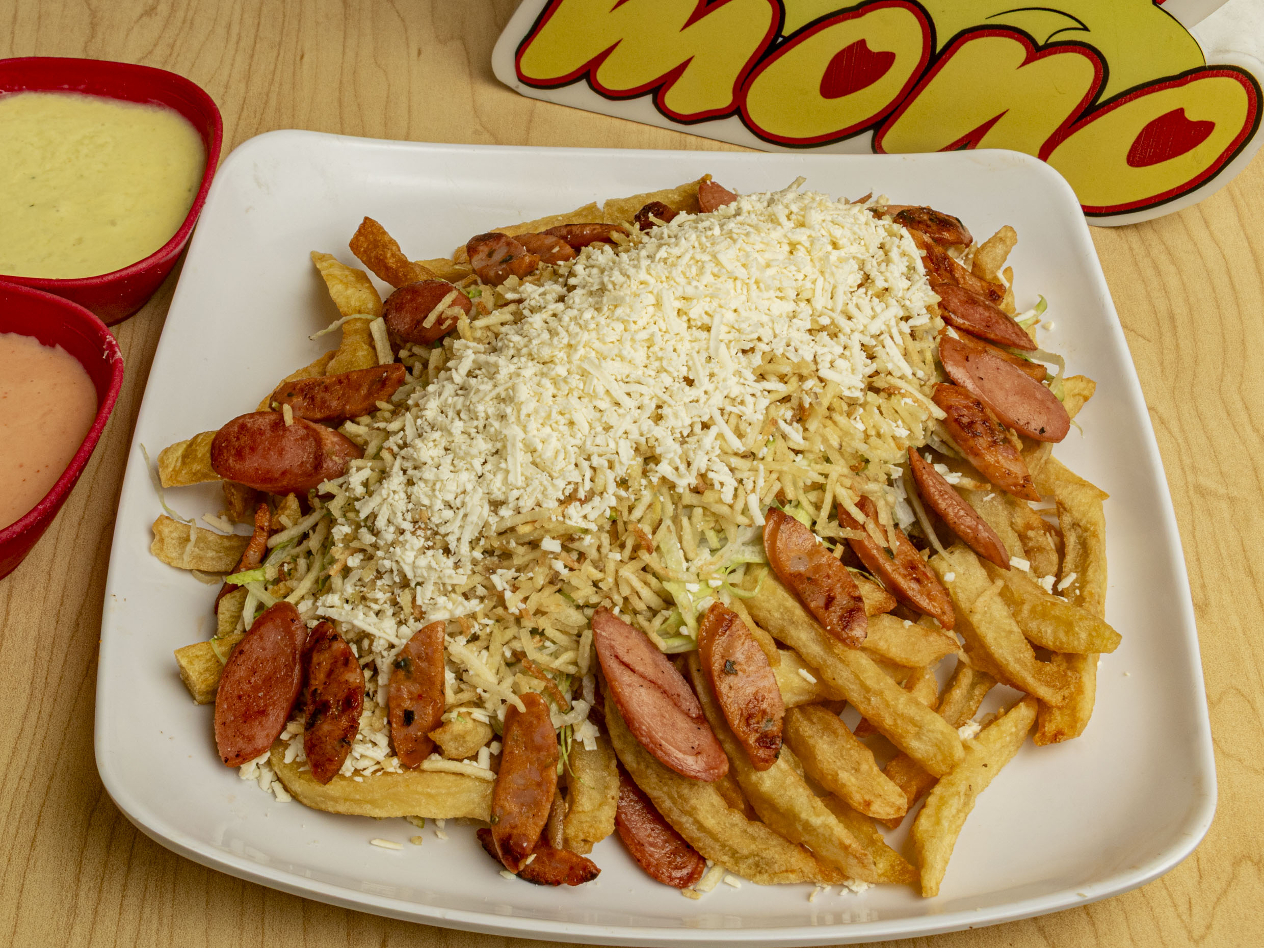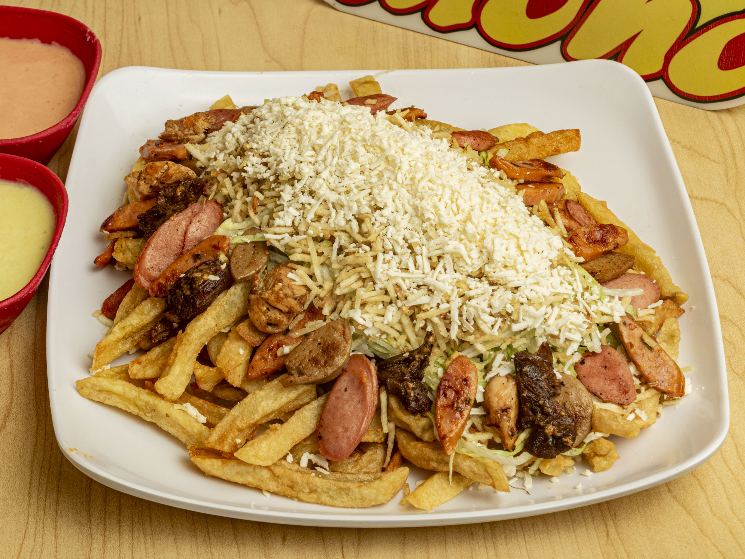Queso costeño rallado, 150 g de papa a la francesa, lechuga, papa chips, salsa rosada, salchicha Zenú, carne de pollo, chorizo y butifarra (120 g aprox. de proteína).