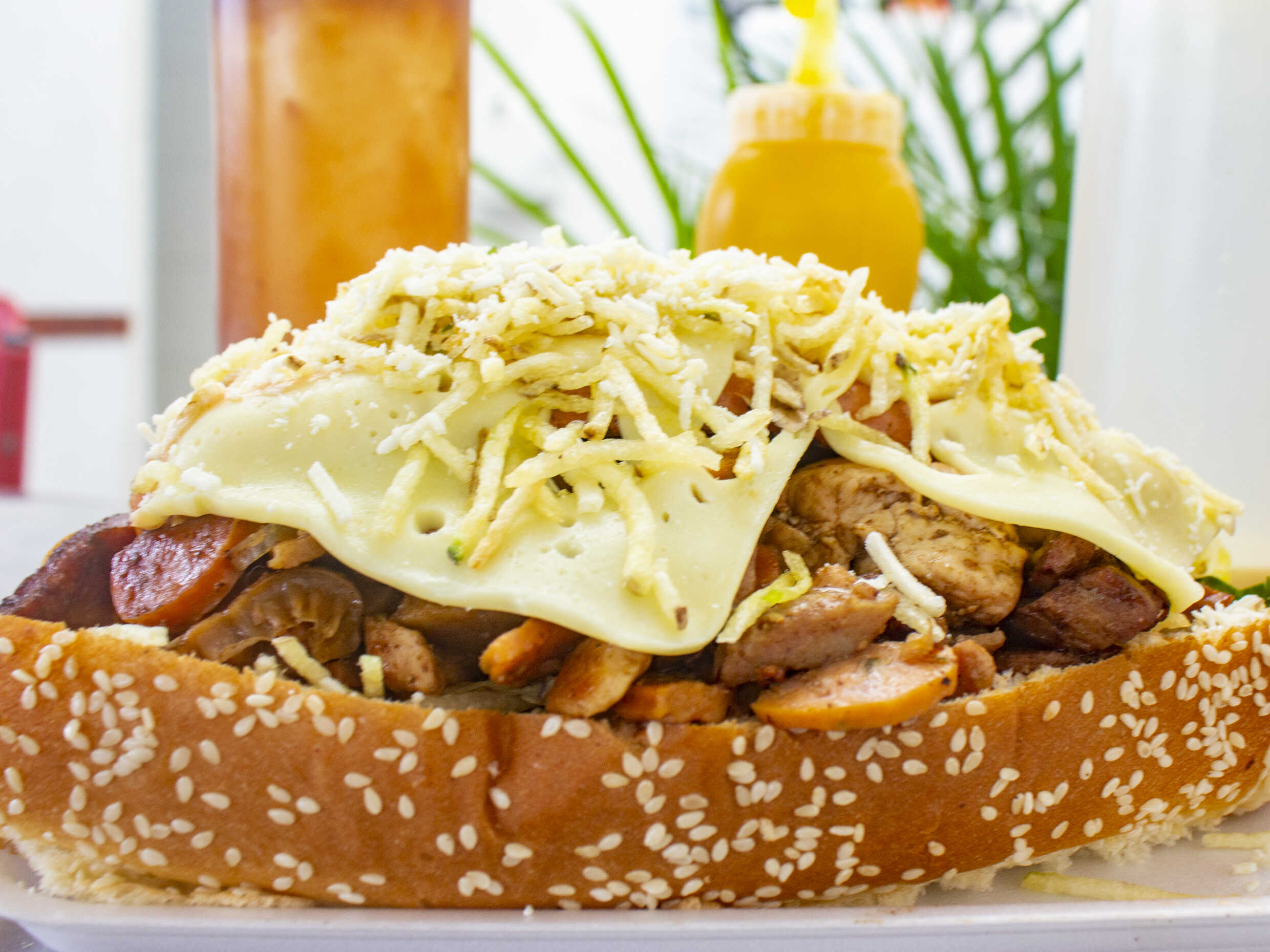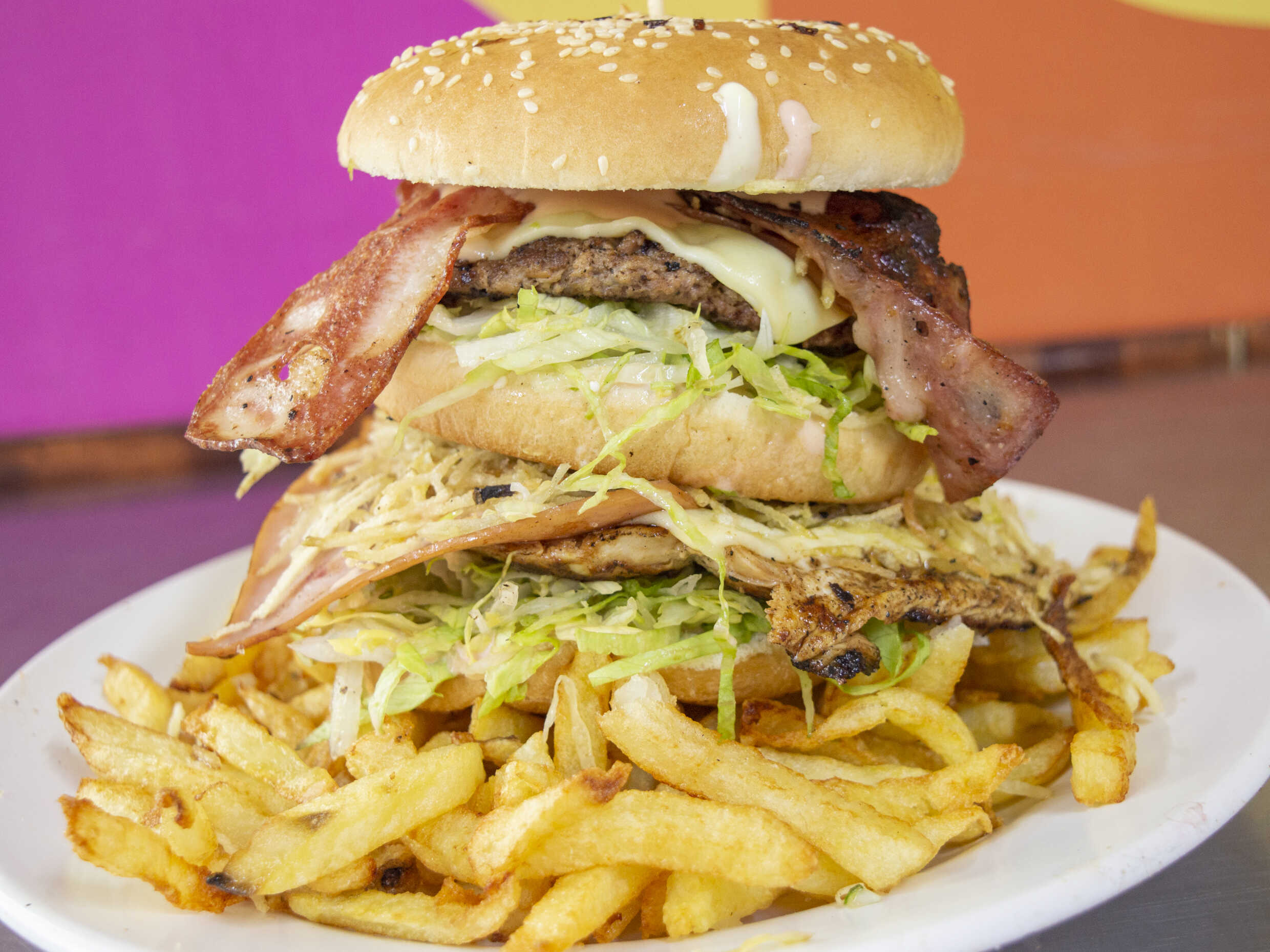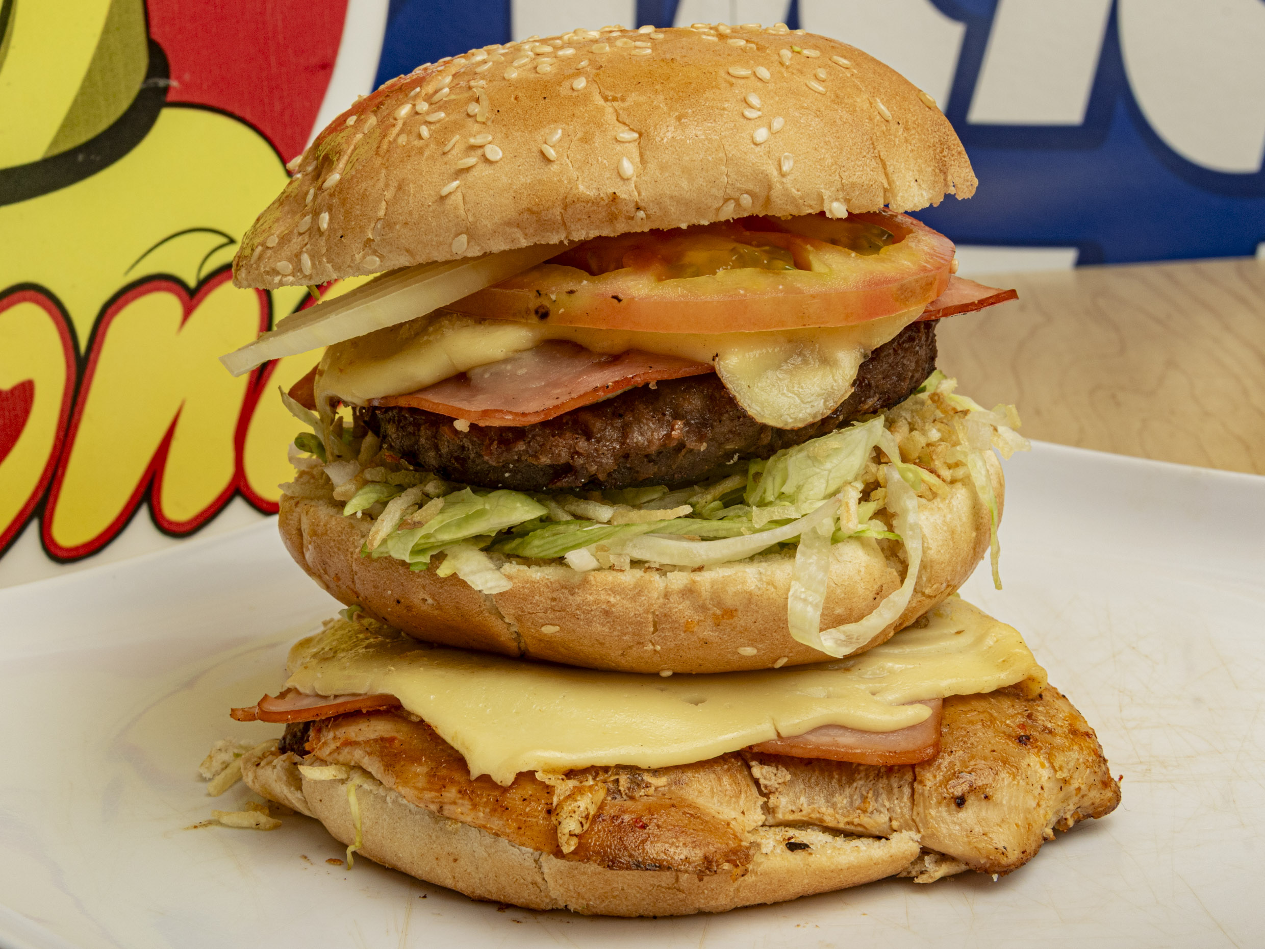 Pan bimbo, queso mozzarella, jamón pietran, lechuga, cebolla, tomate, salsa rosada, doble pollo, doble carne, papa a la francesa y 1 piso de butifarra.